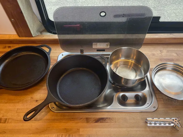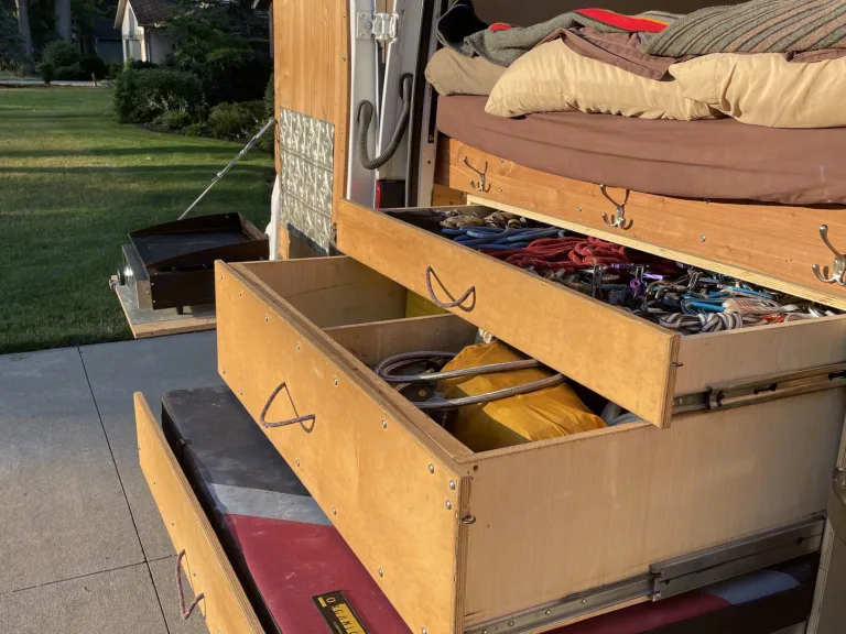 There is cubby storage above the cabin and bed for clothing and other lightweight gear. The passenger seat swivels to face the living area, the fridge also acts as an additional bench seat. The sleeping area converts from a seated backrest to a full size bed with an additional nook to spread out in.The kitchen was designed to maximize counter space with a maple butcher block finish and propane stove. A top loading dometic fridge pulls out from below the counter. Crocheted hanging baskets above the counter hold snacks. There is a deep stainless steel foot pump sink delivering 12 gallons of fresh water. They are removable for flexibility in filling. A roof mounted vent fan and two corner fans provide fresh air even in the rain. Located under the passenger seat is an espar diesel heater, it keeps the van warm and dry in the coldest temps.Accessed via the rear doors are three massive sliding drawers for gear. In addition to the drawers there is a door mounted bike rack. A padded seat pulls out from below the drawers for outdoor lounging.***Pickup and drop off times are flexible(ish) we do work as teachers and as such gotta stick to our schedule, but please reach out and see if we can work something out***What's includedIncluded with the rental are the following:Fresh Towels and Linens