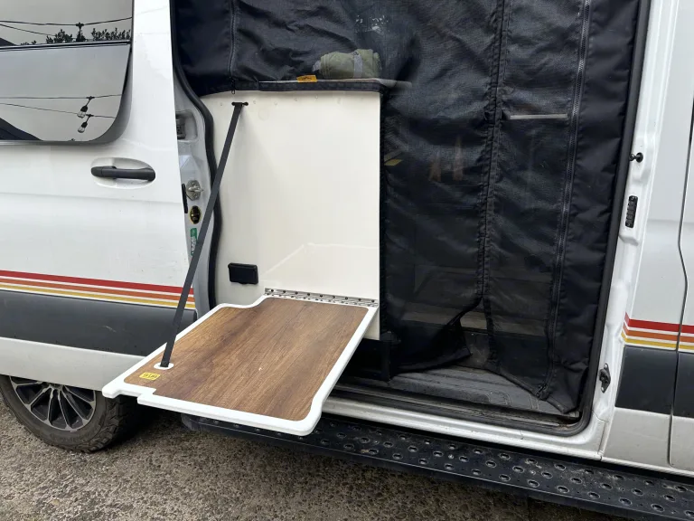 And maybe you want to take your furry friend as well? No problem, well behaved dogs are always welcome!The van has a kitchen with sink, fridge, a portable induction stove top, comes with pots and pans, dishes. It also has an indoor shower that is folding out / stowing away in one of the overhead cabinets.I have racks for two bikes mounted on the backdoors of the vehicle. Ask me about a skibox, Starlink, anything else you're wondering about the van.Get ready for your adVANture of a lifetime!