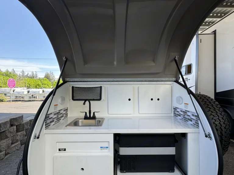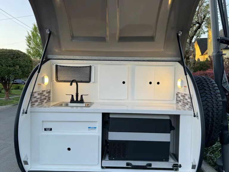 This rental experience is brought to you by Tiny Trailers PDX, a small local business that provides seamless travel trailer rentals under 21ft in length - making towing accessible to all sizes and shapes of cars :)The 2024 Little Buggy 12LRK is the perfect size for 2 people looking to get out and explore the outdoors whether your site has shore power or not! Total length of trailer is 14ft 8inches. 1,595lbs dry weight means most cars can tow! The attached solar panel allows you to extend your adventure without the worry of running out of power. Please note that you must have shore power to operate the AC and/or Fireplace, as this cannot run off solar.The interior of the cabin is outfitted with a 6-inch memory foam Queen bed that can fold into a couch when not using at night. An Hdtv and antenna which can get local channels if in range of satellite. Plenty of pockets and cubbies to store your items. Lighting throughout the interior of the cabin as well as a fan to circulate fresh air into or stagnant air out of the space, makes teardrop camping a "breeze". If you have shore power, you can enjoy the A/C or fireplace to keep trailer warm or cold when needed. Enjoy a window on either side of the trailer (dual entry doors), so you never miss the view! USB, C-port, and AC outlets throughout cabin and galley for all your charging needs.Open the rear galley equipped with a countertop, plenty of storage, a sink (must have water hookups at site), and a dometic fridge cooler (need shore power to use) to keep all your items nice and cold for your trip. If you do not have shore power at your site, we can provide a cooler in place of the fridge. We provide a Eureka 2 burner stove, 3 pots/pans, dishware for 4 people, and a portable 1.2 gallon propane tank (equal to 5 single-use green propane bottles)!The exterior also has a tongue box located on the front of the trailer for added storage, a hose for washing items (must provide your own water to fill tank), and an awning that provides shade and coverage.Rent from Tiny Trailers PDX and feel the difference in service and care that we provide to all our adventurers. It's the tiny things that count!What's included-Fresh linens & comforter/pillows