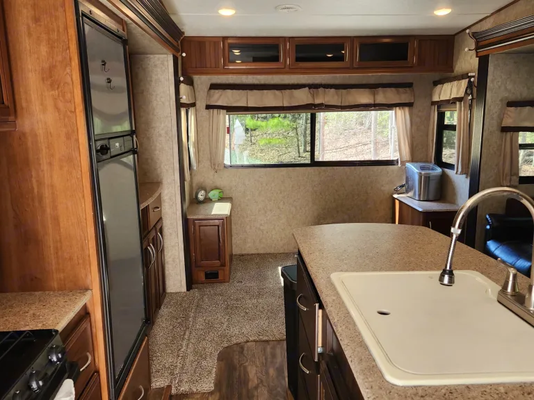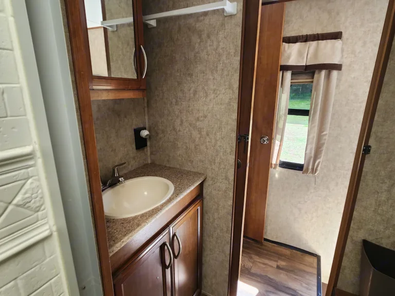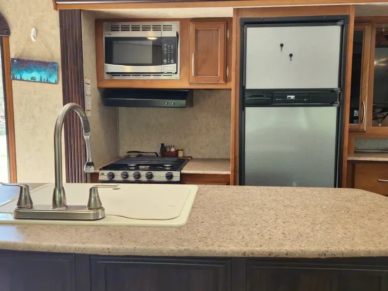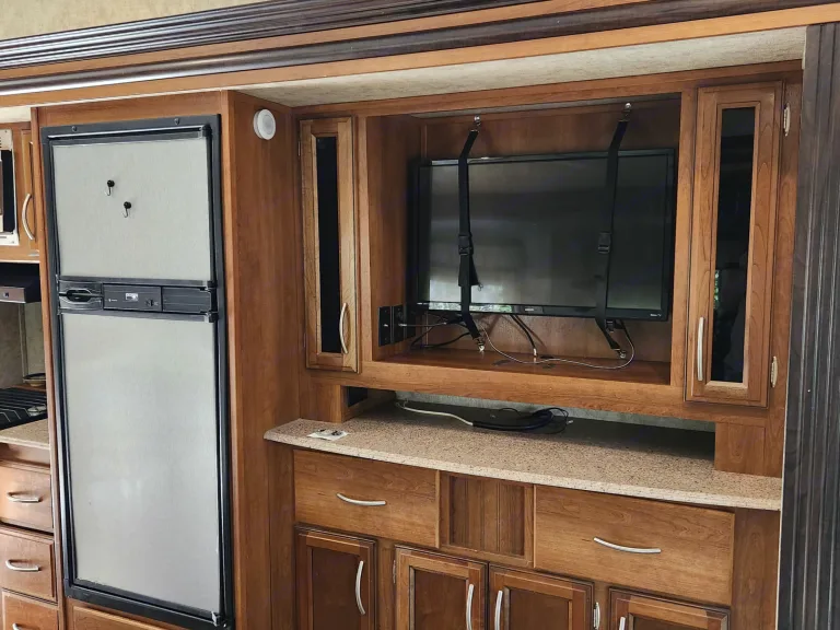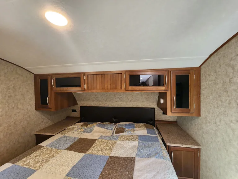 Has plenty of cabinet space, shower, vanity & toilet, new mattress, 2 slide-outs, out-side shower, grill. Inside has silverware, plates, cups, glasses, coffee maker, pots & pans, sheets & blankets, and 2 TV's.