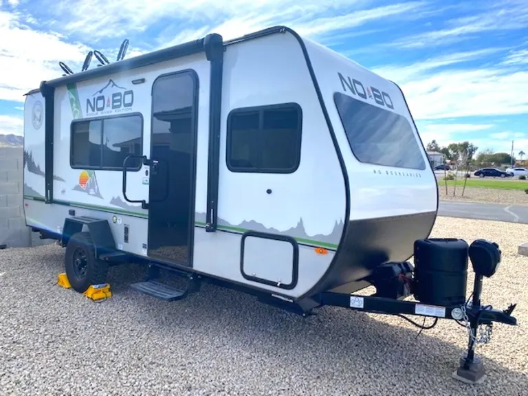 Panoramic Front WindowBeen searching for an adventure trailer that is just under 3,500 lbs. with bunk beds? Your search is over! And the bottom bunk even includes flip-up adventure storage so you can stow luggage, bicycles, and lawn chairs safely inside through the exterior door before you start traveling. The booth dinette seats two and sleeps one, plus the full bathroom offers a space savings radius shower to stay refreshed for whatever is next. And the 11' awning provides an outdoor living area protected from the sun.The No Boundaries by Forest River are easy to tow by a four or six cylinder vehicle with trailers ranging in weights from under 2,000 lbs. up to 5,000 lbs.. Depending on the Nobo you choose, you will find independent torsion suspension with industry-leading cargo capacity, 6-lug satin black aluminum wheels and All-Terrain tires, frame-mounted walkable steel fenders, a laminated Azdel exterior, a Cold Weather package, and a fully walkable 500 lb. roof with PVC roofing membrane.