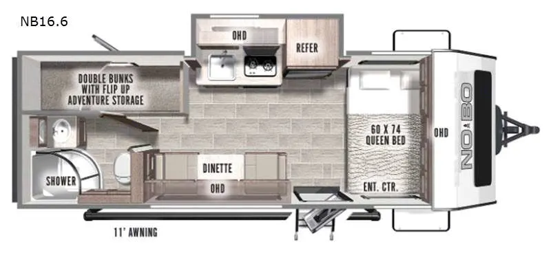 Been searching for an adventure trailer that is just under 3,500 lbs. with bunk beds? Your search is over! And the bottom bunk even includes flip-up adventure storage so you can stow luggage, bicycles, and lawn chairs safely inside through the exterior door before you start traveling. The booth dinette seats two and sleeps one, plus the full bathroom offers a space savings radius shower to stay refreshed for whatever is next. And the 11' awning provides an outdoor living area protected from the sun.The No Boundaries by Forest River are easy to tow by a four or six cylinder vehicle with trailers ranging in weights from under 2,000 lbs. up to 5,000 lbs.. Depending on the Nobo you choose, you will find independent torsion suspension with industry-leading cargo capacity, 6-lug satin black aluminum wheels and All-Terrain tires, frame-mounted walkable steel fenders, a laminated Azdel exterior, a Cold Weather package, and a fully walkable 500 lb. roof with PVC roofing membrane.
