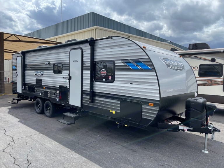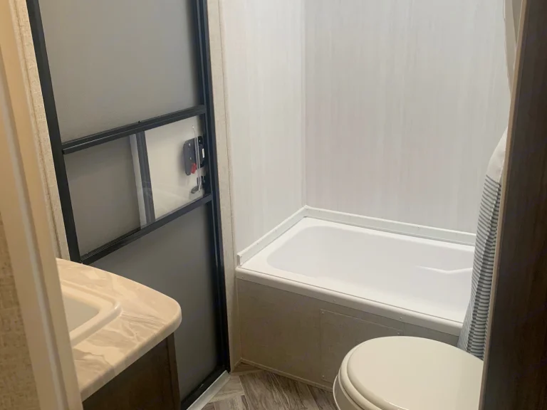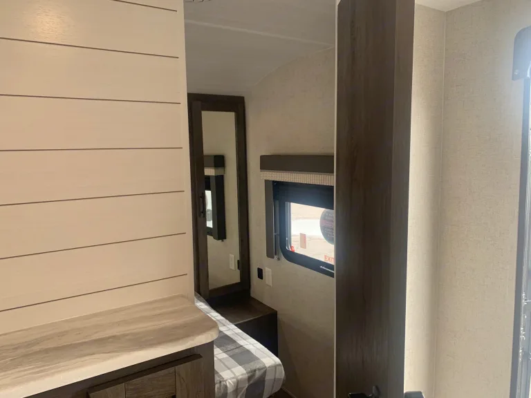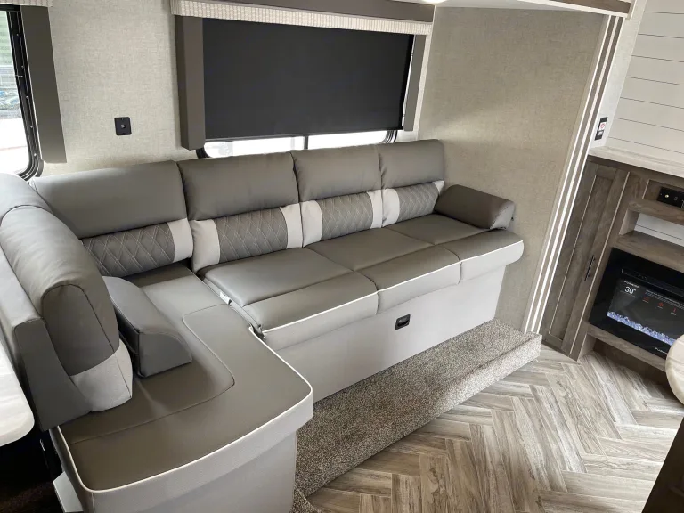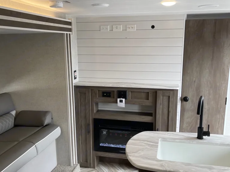 This unit was purchased in March 2021. It has a Queen bed in an enclosed room. A sofa that converts to a bed that can sleep 2. The dinette converts and can sleep 2 more. There are 2 bunks in the back that can sleep 2 children easily on each.There is a full kitchen with good counter space. A refrigerator, stove, oven and microwave. A large pantry right next to it. There is a TV in main living area the Bedroom. USB outlets are all around the camper.Heat producing fireplace.Outside shower, refrigerator and grill. 1 large slide to maximize your room and comfort. 16 foot power awning.The RV is equipped with Electric leveling jacks and Electric Hitch Jack.Weight Distributing Hitch is suppliedPortable RV Generator is available for Rent.What's includedThe unit has a nice fat queen bed. Plastic cups, plates and utensils will be included.A weight distributing hitch is required and will be supplied.