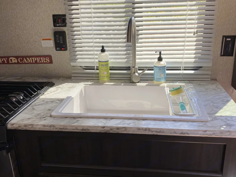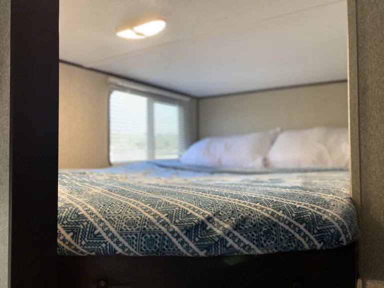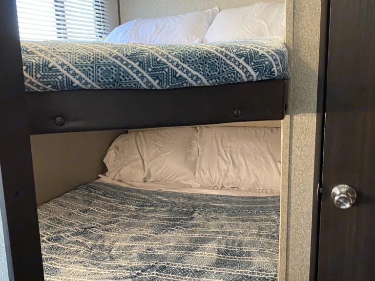 Great for camping with the family! We camp often with or 2 year old & 11 year old and we all sleep comfortably. There are 2 full sized bunkbeds, a queen bed (in its own room!), the dinette sleeps 1-2 & the couch folds out and sleeps 1-2. Perfect for beach camping (we even have a outdoor shower), going up to the mountains, or just glamping at your favorite camp ground.