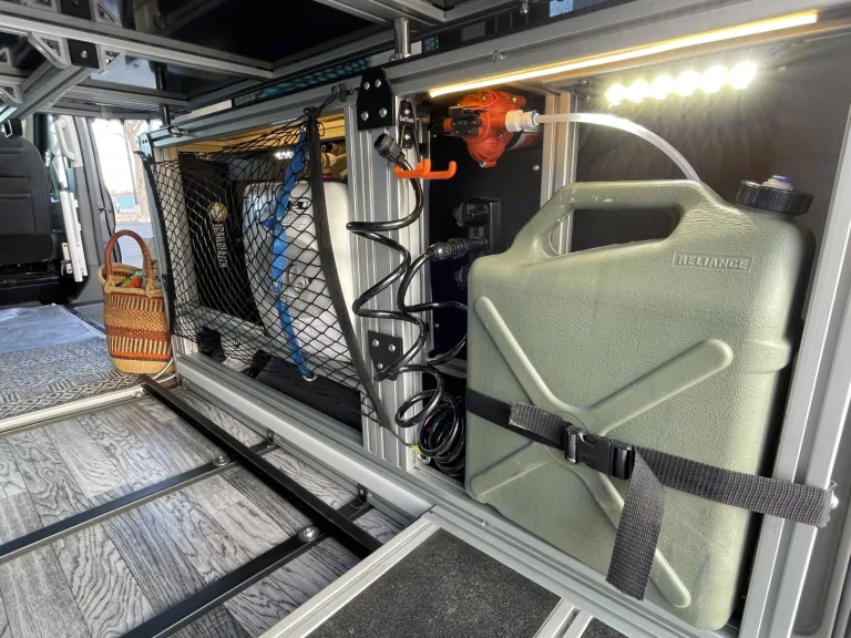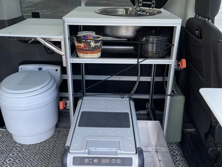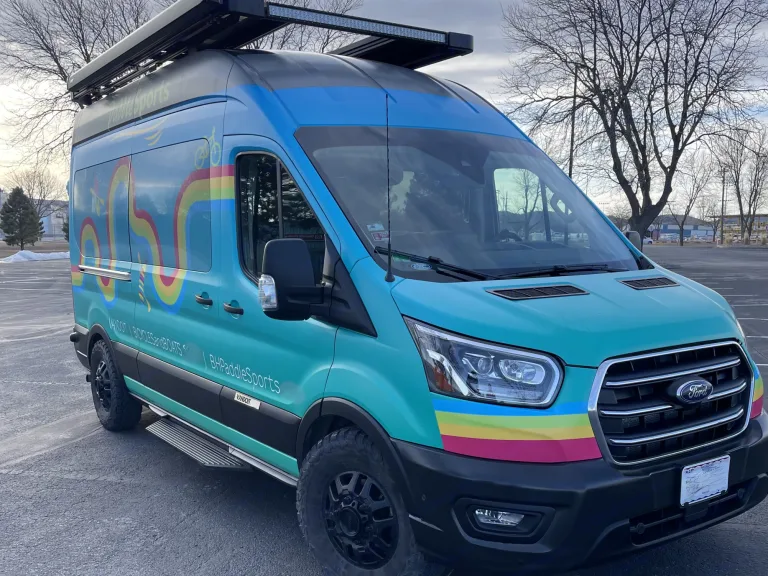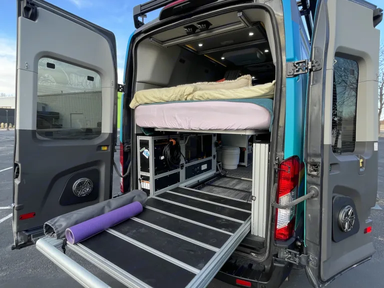 Fun, modular adventure van ready for camping during any season, whether on-grid or off-grid.Built on the Ford Transit platform, this High-Roof AWD van is more enjoyable to drive and park than larger RVs. It has a standing height of 6'3" which is great for taller folks. The van seats up to 8 people with 6 removable seats for more floor and storage space. It has a queen-size bed on a fixed hydraulic platform that comfortably sleeps two adults and can be raised/lowered depending on your setup needs. Additional space in the cargo/gear slide area can accommodate either a twin or full-size inflatable mattress - perfect for another adult or a couple of kids.This van features a custom professional conversion by VanDoit (based in Kansas City, MO). It is equipped with running water, an on-demand hot water heater, an outdoor shower, solar panels, an AGM battery bank, multiple outlets, a MaxxAirFan for ventilation, an air conditioner, Espar heater for colder temps, and tons of storage space for all your adventure gear!Framed inside with 80/20 T-Track, the amenities are modular & the floor plan can easily be changed to accommodate your needs. You can even hang a hammock inside.This van is kid, pet, & festival friendly.** Unless requested otherwise, the default configuration will be seating and sleeping for 2. The rear 2 & 3-person bench can handle 2 rear or front-facing car seats. Important note: The cargo/gear slide area cannot be used for sleeping if all 8 seats are in.