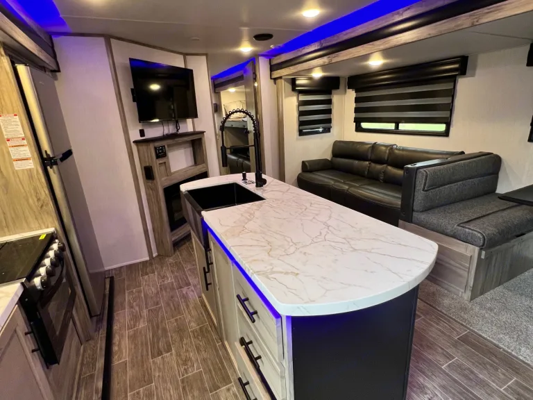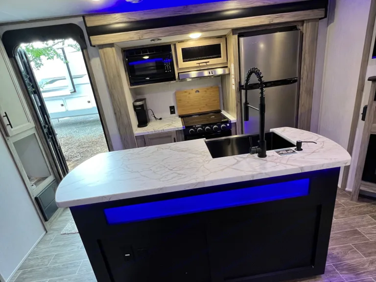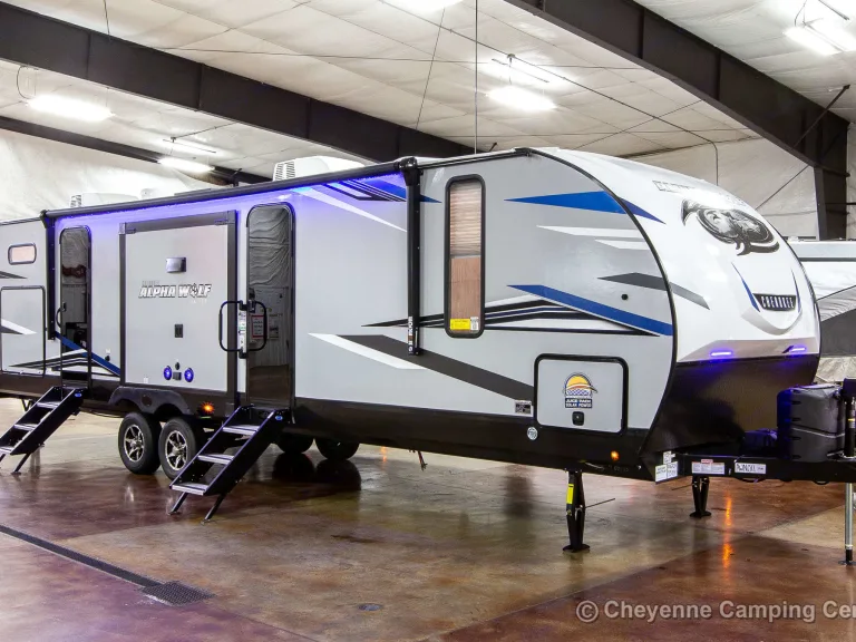 This new 2022 Forest River Cherokee Alpha Wolf comes with 3 slide-outs and outdoor kitchen. It is the perfect family bunkhouse that will sleep up to 8. There is also a private 1/2 bathroom and second entry door. The master bedroom has a queen size bed. Additionally, it has a power awnings and LED lighting to enjoy nights outside with family and friends.Provided for your stay: