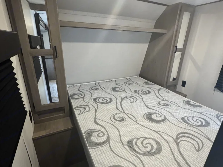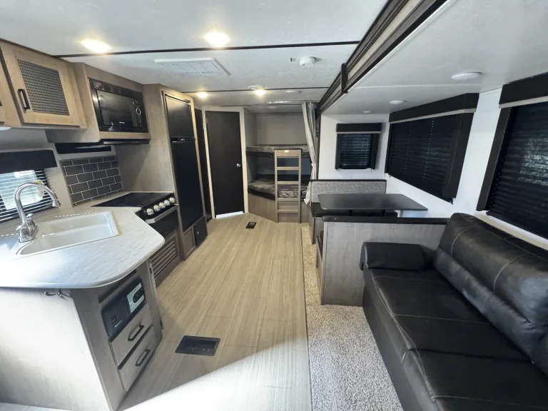 This family-friendly travel trailer comfortably sleeps 8-10 with private and bunk areas.