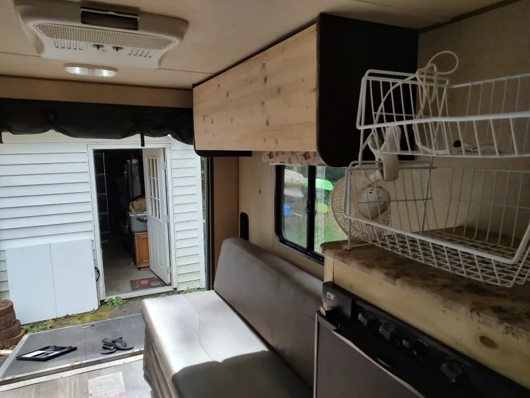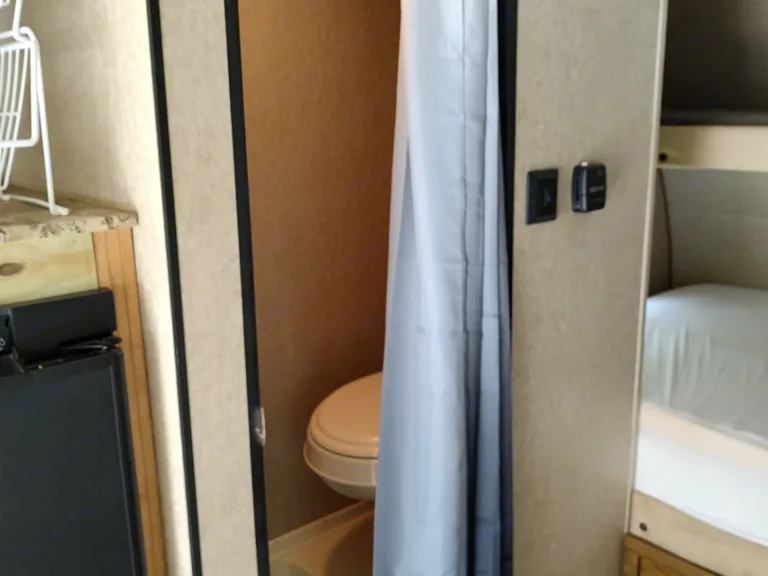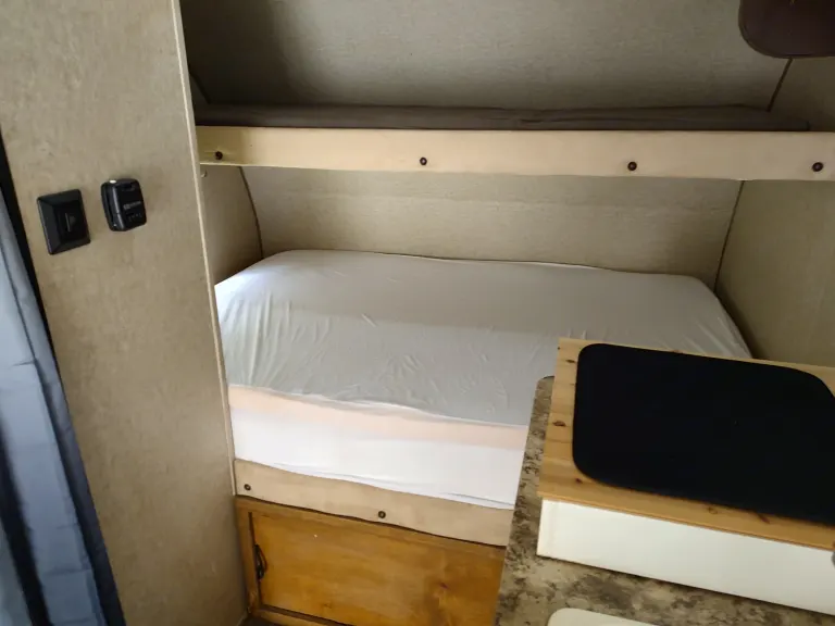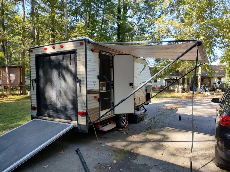 This was a great RV for our quick weekend trip. We were able to fit our Honda Shadow Tourer 1100 in the back, cook all our meals on the two burner stove and sleep well in the twin bed in the back. Te second night we decided to put a queen air mattress on the floor (toy hauler section) to give us a bit more room to sleep. My favorite part is that you could let the back ramp down and drop a screen window down like a tent. That gave us fresh air while sleeping. This is one of the smallest RV toy haulers available and it did well for us. A bit tricky to pull it out and back into the driveway at Daniel's house, but overall a really great experience!