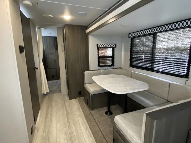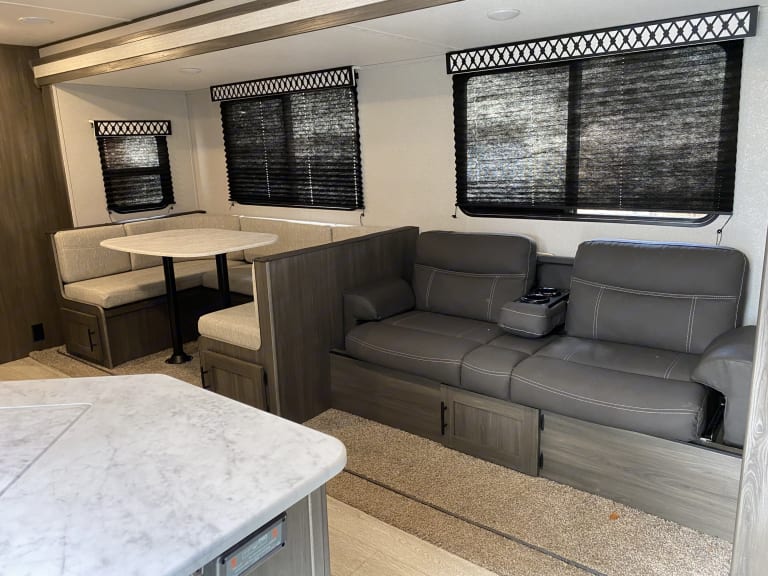 What's includedThe RV comes fully stocked with linens, dishes, cookware, food condiments/spices, toiletries, coffee maker with coffee and filters, garbage bags, paper towels, blow dryer, and more. Extra cots (up to 2) are available upon request.Netflix Included.This trailer is a pet friendly trailer and we also have a pet gate set (seen in the last picture) available to rent for $40 at pick-up (cash or Venmo). It does take some extra time to set this gate up, but very much worth it in our experience. Other things to noteDelivery ranges can be flexible, so feel free to reach out about options. If you have any other questions or special requests that might make your camping a smoother experience, please don't hesitate to ask!