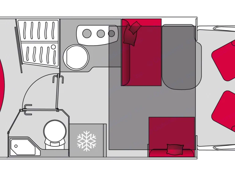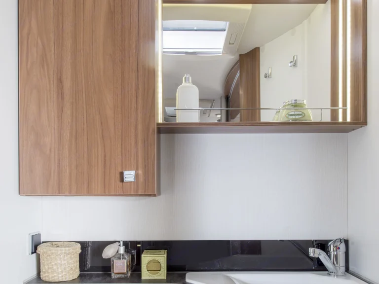 Grand salon accueillant avec une capacité d’accueil de 5 personnes. La pièce à vivre est lumineuse grâce au skydôme et toit panoramique. La table repliable et coulissante facilite la circulation. Le grand lit de pavillon offre 2 couchages supplémentaires.