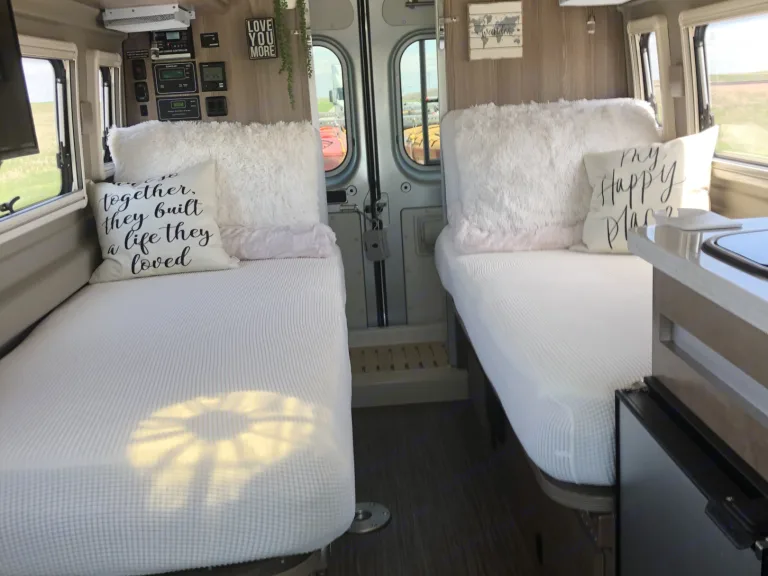 Try out the Travato, the top-selling Camper Van in North America. This is an easy to drive, easy to operate van that is great for 2 people. It is a fuel and energy efficient rig that will keep you traveling comfortably, regardless of the elements.The van sleeps two comfortably. There are two twin beds made with high density hygienic foam on top of a suspension system to increase comfort, relieve pressure and improve air circulation. These beds can convert into an oversized queen. A custom, blow-up mattress can be added for a fee to sleep a small, third person. This mattress fits over the front and passenger seat.The van contains all the comforts of home - heat & air conditioning, full kitchen with a convection microwave for baking and a full bath with shower and television.