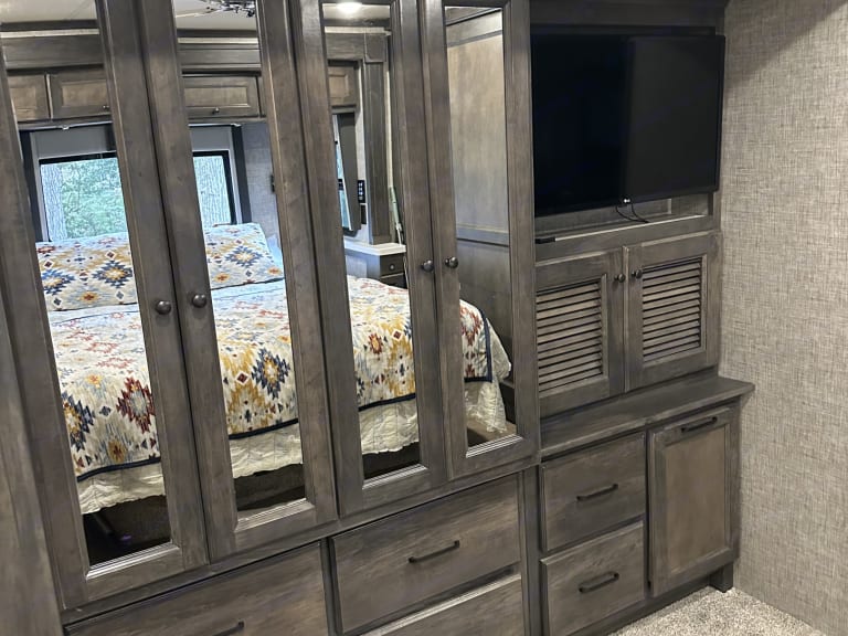 Come enjoy our new Motorhome and explore this beautiful country of ours. Sleeps 6-7. One king bed, 2 twin bunk beds, one full size bed. The breakfast nook can be converted to sleep 2 more children or a shorter adult. 1.5 bathrooms. Washer/ Dryer combo. Dining table for 4 with seat belts. Sofa with 2 seatbelts. Full size fridge and freezer, gas fireplace. Outdoor shower. 2 Slide outs. Several TV's throughout (one outside) and plenty of storage.