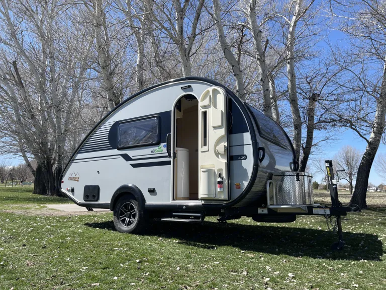 Ultralight teardrop camper with all the luxuries of home that sleeps 3 comfortably. At only 2900 pounds you will have all the amenities of home including; shower, heater, fridge, stove, sink, table, bed and air conditioning (requires generator or shore power). This little teardrop is very easy to tow and has electric brakes. Extra high ground clearance insures you won’t have to worry about large dips or curbs.The house batteries are kept charged with a 200 watt solar panel. Lots of LED lighting throughout the trailer inside and out.This trailer requires a 2 inch hitch receiver, 2″ ball and a 7 pin trailer wire connector is required for towing. Make sure your vehicles trailer hitch is able to handle a 400 pound tongue weight capacityKitchen supplies, including pots, pans, utensils, plates, cups, bowls, kettle and coffee press are included in each rental. Camp chairs for your entire party will also be included. Coolers, BBQ’s, firewood, bear spray will be available for additional fees at pick-up.Get out and explore the Intermountain West in the east to tow Tab 400 Boondock!