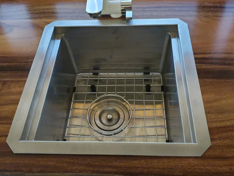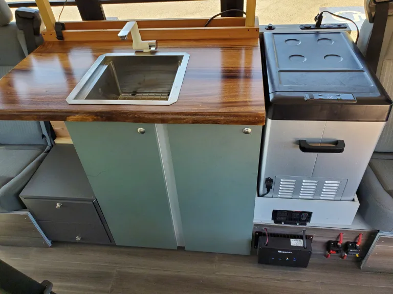 kitchen sink with electric faucet, 2-burner infrared stove, cabinets