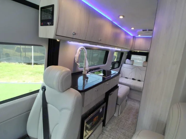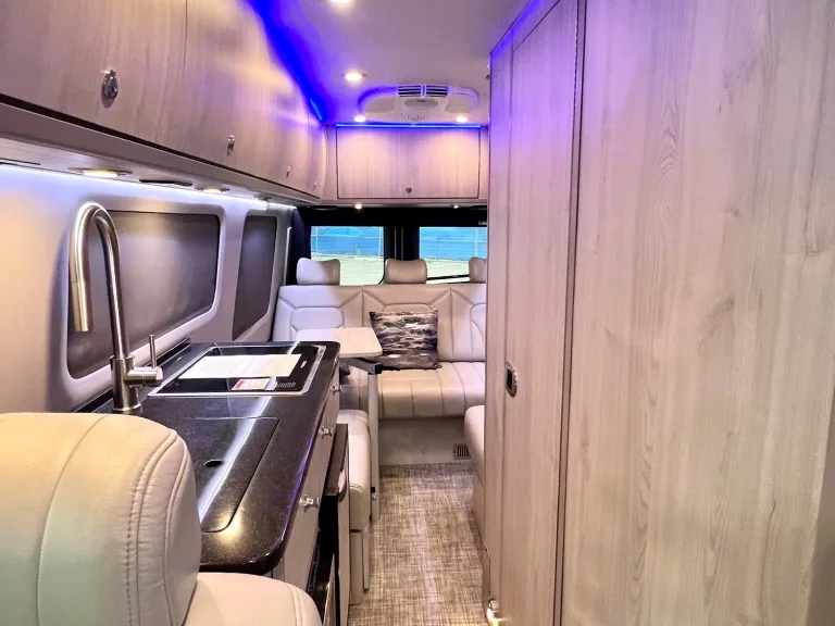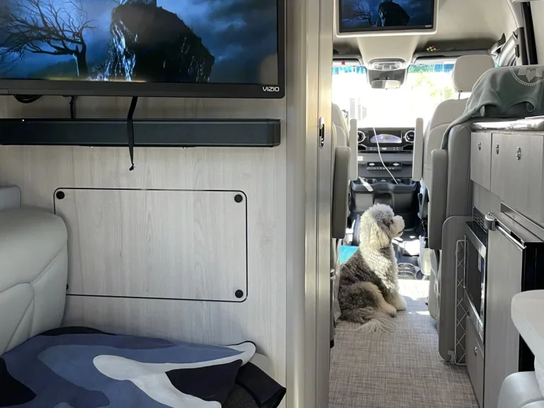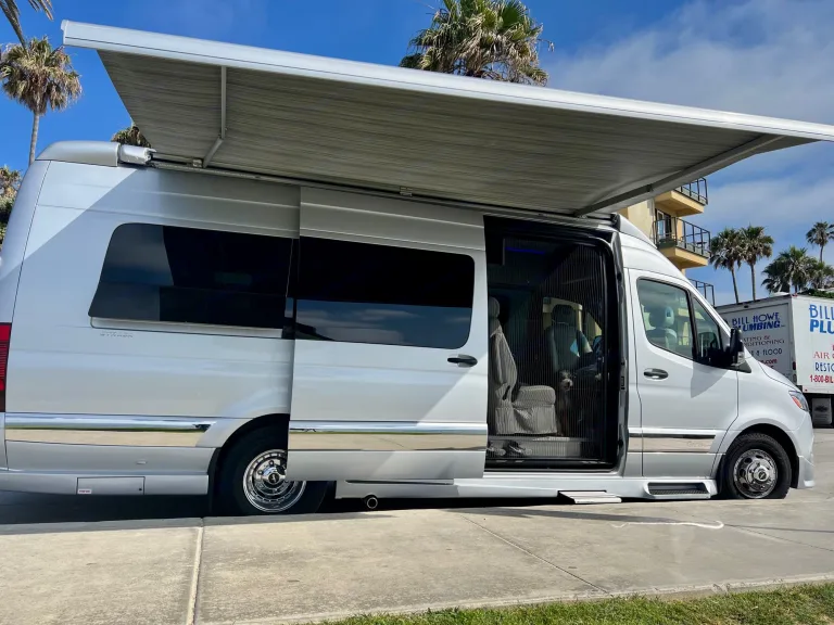 Enjoy outdoor without Roughing it! This is the best and most luxurious Class-B Mercedes Van you can rent! Comfortable and smooth drive with In-Dash navigation system and Apple Car Play accessibility. Spacious living area with two 24” LED Smart TVs. Blu-Ray/DVD player, Wifi/LTE Antenna, Bose sound-bar w/ premium sound system. Hdmi input. 2 cooktop burners, refrigerator/freezer combo, Convection Oven/Microwave/Air Flyer combo. Private enclosed Wet bath (Ceramic toilet!) & shower with a window w/privacy shade. Power lift vent fan with rain sensor. 300 watt solar power so you can enjoy the off grid comfort. Power awning with LED lights. Power screen and shades for rear door & windows. Memory form soft headrest and seating through out the coach. Extra storage area in the back of the coach. This van is perfect for your ultimate road trip.