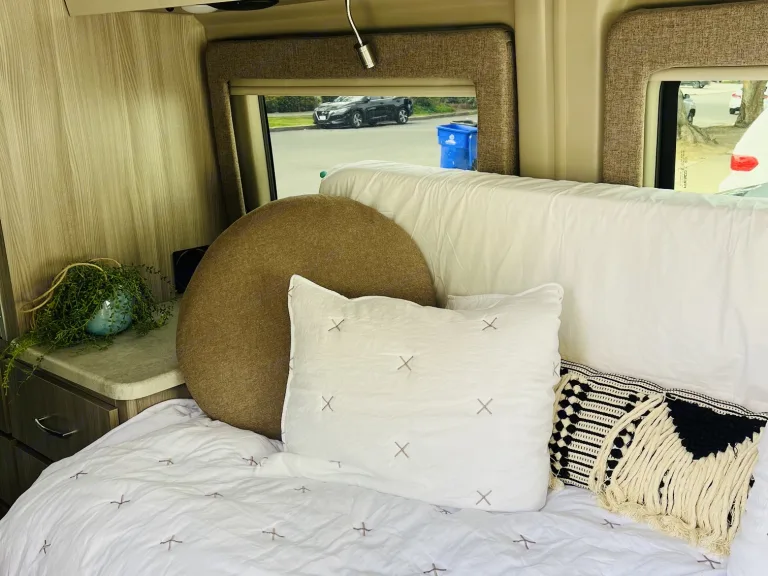 There is a propane gas 2 burner cooktop and microwave convection oven on board. There is a max air fan in main cabin and a small fan in bathroom. 2 operable screened windows allow for nice cross breeze and a full screen at sliding side door. Truma-Combi Propane gas Heat and hot water. Tinted full window van with great pull down privacy shades. There is a very comfy twin bed with simple slide system to convert to roomy queen. Built in smart tv for all your favorite apps including amazon prime, netflix and youtube! Under Hood Generator will recharge the batteries to 100% in 1 hour of driving. There is a double bike rack on back and a power awning. Come have some fun by the beach and see what Van Life in Southern Cali is all about!What's includedFresh Linens