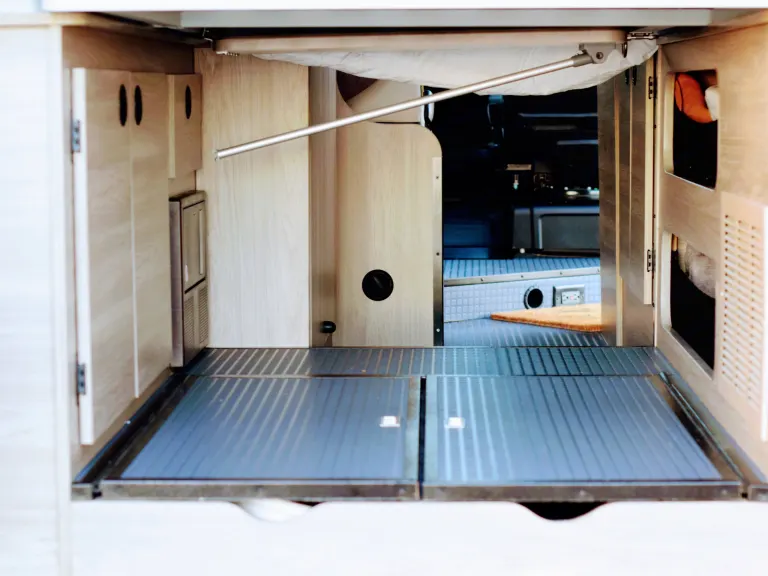 The Solis 59PX comes equipped with additional space in the back that allows room for bikes to be stored inside. Most bikes are able to be stored inside when the bed is folded down (some mountain bikes and electric bikes may be too large). The track system allows you to tie down your bikes or utilize space by hanging additional gear.Galley: