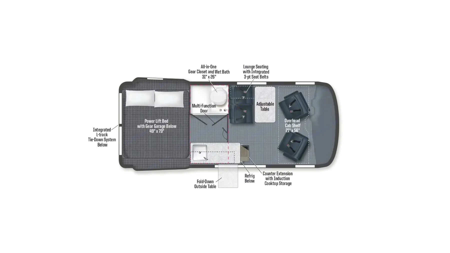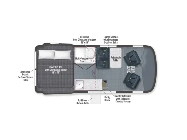 Interior Width: 6’7″Winnebago Revel Interior Gear Garage/Power Lift BED Measurements:BED Raised