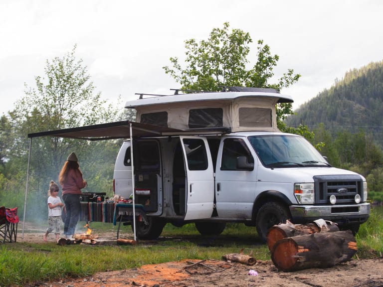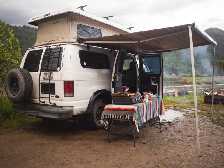This is a 2009 Ford Econoline that has been converted to a sportsmobile camper van. The pop top creates a spacious environment with full standing height room. The van does have a rotating passenger seat and a small dining table that can go between the couch (bed) and this chair. This van is great for boondocking and while it is 2wd, it is perfect for many of the forest service roads here in North Idaho and Western Montana. The van is equipped with two beds, one inside of the pop top and one on in the base level. The bed on the bottom can be rotated into a couch or a bed. The "top bunk" is surrounded by the canvas pop top and has windows that can be opened with screen covers. The bottom level has the slider windows of the van that can also be opened with screens to create great airflow. There is also a full set of window coverings for the van windows for added insulation and privacy along with screens for the doors to keep bugs out while the double doors are open. This is a cozy little van that drives like a car and sleeps comfortably. The van does have CarPlay and a pretty sweet sound system so the drives to and from your campsites will be fun! What's included• Cooler