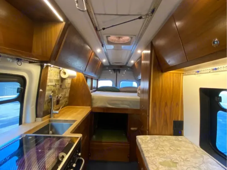 Our beautifuly built Campervan comes with everything you need for as long as a trip as you want!This vehicle was designed for complete long term off grid living.Tons of features!Kitchen: 3 burner/oven stove, large deep sink, lots of storage, dual zone refrigerator (optionally a freezer section)Electrical: 560amp of LiFePO4, 2000watt pure sine inverter, 400w solar, external power hookup, Alternator smart charging, water heater, USB, 110v outlets all over, ceiling dimmable lighting, mood lighting, dual exhaust fans,Water System: Internal and external water tanks (10g and 45g), gray water tank (25g), water heater, filtration system, outdoor showerExtras: Couch that converts into second bed, shower, cassette toilet, fantastic diesel cabin heater, dog bed or quick access storage area, huge garage, awning.