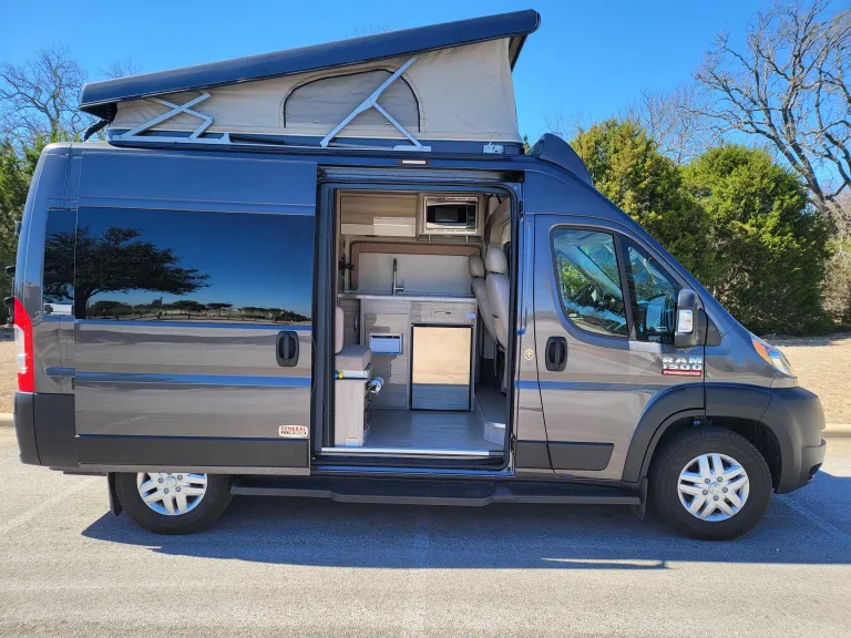 We can’t wait to welcome you to your home on wheels! Plan your unforgettable outdoor getaway with our brand new Thor Motor Coach! It is equipped for any adventure on a proven and easily driveable RAM Promaster 1500 chassis.Whether off-grid exploring or campgrounds are your style, experience true freedom without sacrificing convenience or comfort. You’ll be prepared for a short or long-term adventure with equipped solar, lithium batteries, AC, heater, a large full water tank (27 gallons), and a full propane tank. With leatherette front captains chairs and Apple AirPlay for music and navigation, getting to your destination(s) will be part of the fun.You’ll find a iPad Pro (there is also WiFi) above the sink for watching a movie or favorite show after a day of hiking or biking. A fully stocked kitchen[a][b] is ready for you to prepare either a gourmet or an easy campground meal with a two-burner propane stove (propane included), microwave, and fridge/freezer. If you can’t get enough of nature, there is an outdoor propane hookup to cook outside as well. There’s also an outdoor shower!Two cozy sleeping areas await you—a pull-out bed in the living area and the pop-top penthouse suite—making this van perfect for couples or families. The coach is equipped with AC and Furnace to keep you comfortable anytime!There is no shortage of storage space for your gear, whether that be clothes or adventure toys. Bikes can be stored on our bike rack so you don’t have to sacrifice indoor storage spaceWhat's included-iPad Pro