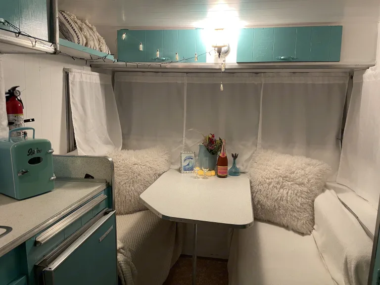 The refridgerator is in repair & we have 2 coolers for your use. 1 extra large & 1 large. We will put ice in both coolers upon delivery.With classic tiffany blue, white and silver throughout, she provides a soothing & refreshing vibe!We also have Glamping Bell tents with comfortable mattresses and all the