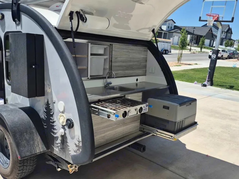 Adventure meets vintage styling in this retro-inspired teardrop trailer designed for modern explorers. It's rugged, reliable, and ready for anything. Sleeps 2 adults and 1 child on the optional cot (or 2 children if you're willing to let one cuddle with you on the queen as we do)—perfect for adventurous couples or small families looking to escape the ordinary.