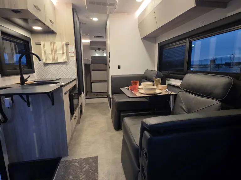 5.0This RV is fantastic. It drives great. It has all the amenities you need. Solar kept the fridge going. Sleeping worked great for four. The screens kept the bugs out and the breeze in. Loved being able to have a clean place to cook meals and sleep. One of the nights it rained and we were warm and dry inside. Being able to control the RV with my phone over Bluetooth was a plus. Great experience!
