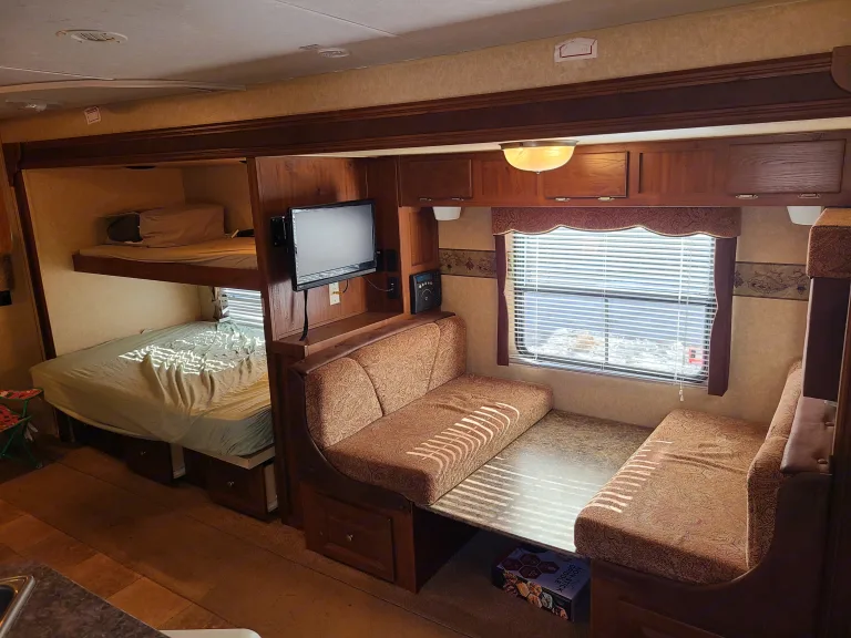 Come spend some time in our wonderful camper! The camper has a 10' super slide that when open allows for a ton of room inside the camper! In addition to the slide-out the master queen bed is a murphy bed that folds down over the couch when it's time to turn in. That means that during the day the bed folds up and adds to the floor space! The bunk area and table area allows for many additional sleeping options. The bathroom is plenty roomy with a lot of storage and the shower offers plenty of room. The kitchen has everything you need ice cold fridge and freezer, stovetop, oven, as well as an outside Blackstone Grill