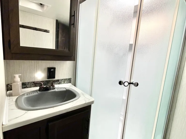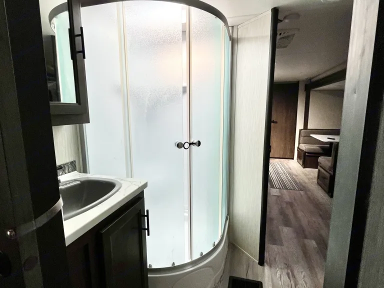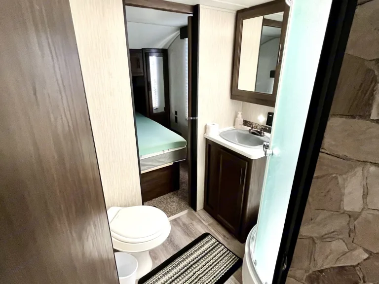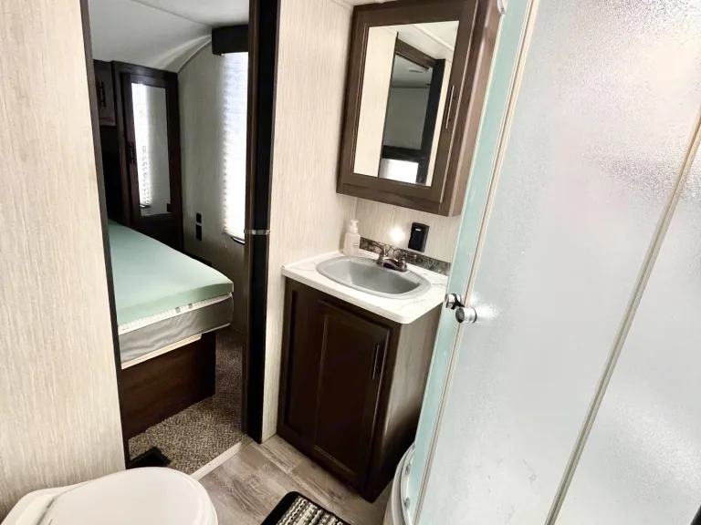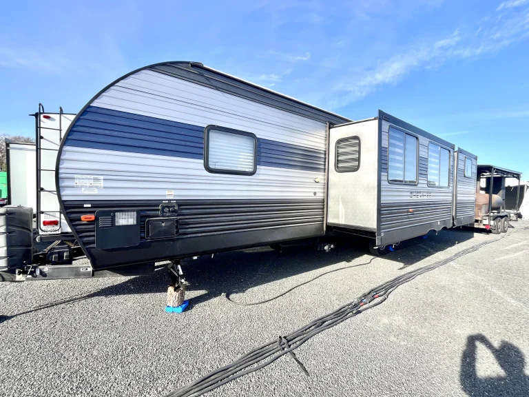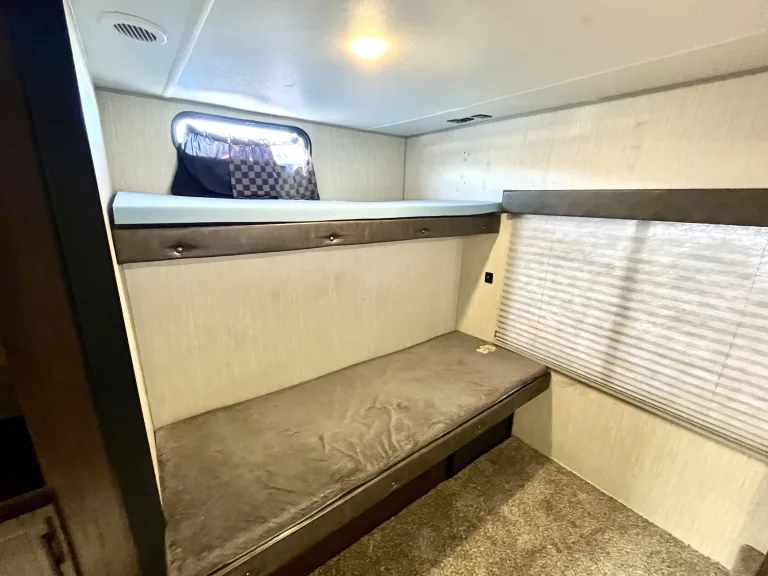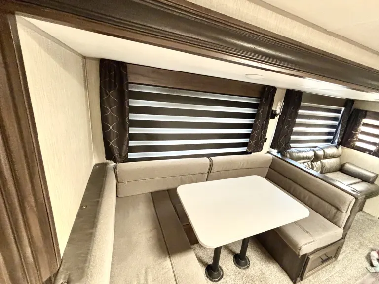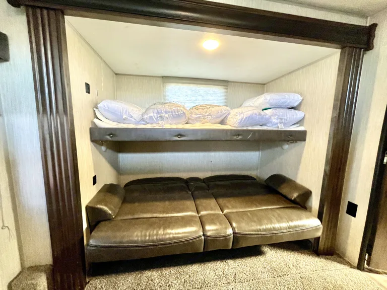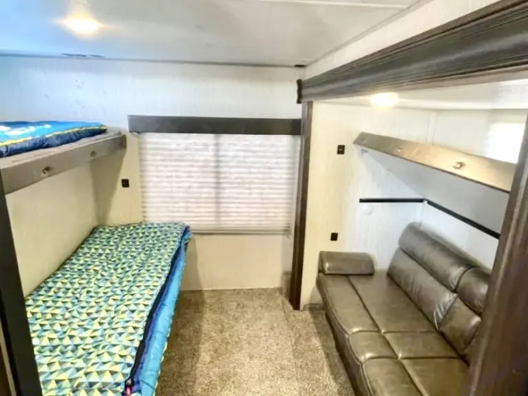 Step inside this huge 37 foot camper and you will see a roomy main cabin with a fireplace and TV, Radio CD/DVD player on an angled wall to the right of the door.Next to the fireplace is the main entry to the bathroom, complete with, a roomy sliding glass door to the shower, a toilet, and sink with cabinets above and below it. There is a second entry to this bathroom from the master bedroom as well.On the other side of the bathroom is the master bedroom with an entry to the bathroom as well as another door to the main cabin. The bedroom has a walk around queen bed with storage closets and cabinets on each side of the bed as well as cabinets above the bed and additional storage access in the base of the bedOn the wall opposite the entry door, there is a jack knife sofa that converts to a bed as well as a U shaped dinette that converts to a bed.To the left of the dinette along the back of the camper, there is a door that leads to the private bunkhouse complete with a jack knife sofa that converts to a bed on the bottom right of the room as well as a drop down bunk above it and two other bunks on the left side of the room. There are plenty of lights and USB outlets for each bed to keep your devices charged.Exiting the private bunkhouse room you will see a closet pantry and the kitchen, complete with a kitchen island with the sink with cabinet storage and drawers underneath, with a large refrigerator, microwave, with counter space and a stove/oven under the kitchen window.The exterior features a large power awning, exterior speakers, an outdoor shower, and an outdoor kitchen complete with refrigerator, outdoor griddle, and sink.