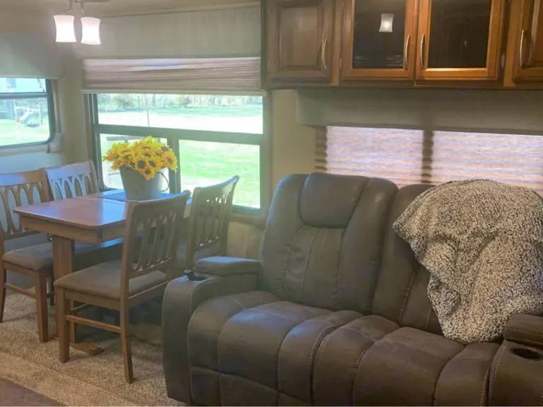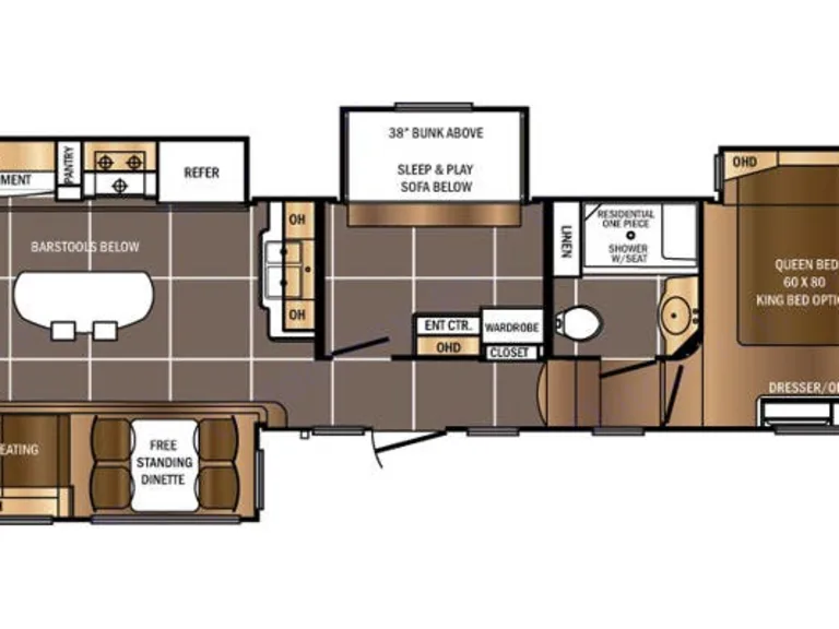 The Sanibel Traveler 38QB fifth wheel by Prime Time features a nice size room for your kids, a large kitchen island, and a rear living area.As you enter the fifth wheel, straight in front of you is a room which can be used as a bedroom, or just a place to retreat from the rest of the family. Along one side of the room there is a slide with a sleep & play sofa and a bunk above the sofa. Across from the sofa you will find an entertainment center and a wardrobe.The kitchen has a double kitchen sink on one side. There are two slides in the main living area. One slide has a free-standing table and theater seating. The other slide has a refrigerator, three burner range, pantry, and entertainment center. Along the rear wall of the fifth wheel you will find a hide-a-bed sofa with end tables on either side of the sofa. In the middle of the kitchen there is an island with bar stools along one side of the island.As you step up the stairs, the bathroom is on the left. Inside the bathroom there is a toilet, linen cabinet which is great for storing towels or toiletries, a shower with seat, and a sink.In the front bedroom there is a slide with a queen bed or an optional king bed. Across from the bed there is a dresser, and along the front of the room you will find extra storage with the large wardrobe. In the corner of the room you will see that is is washer/dryer for your convenience, plus so much more!
