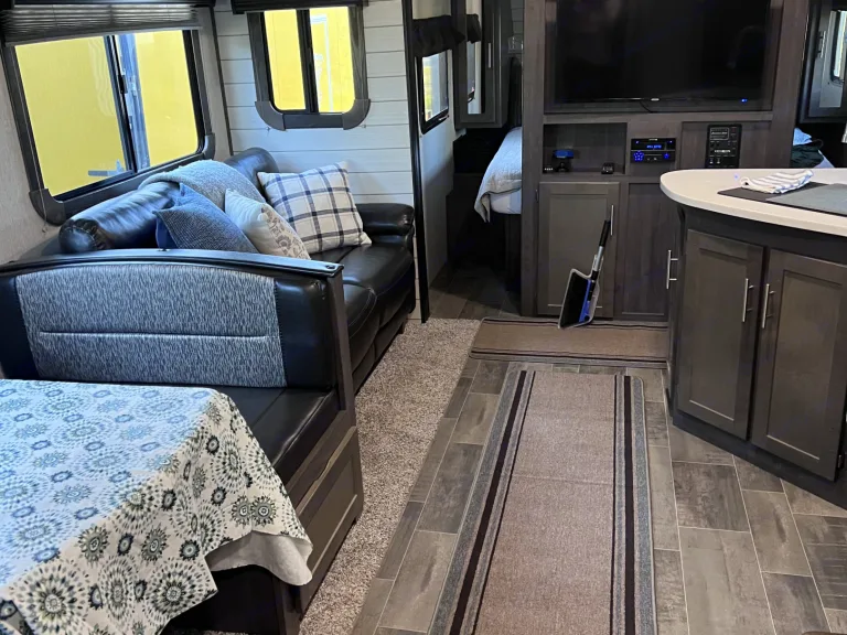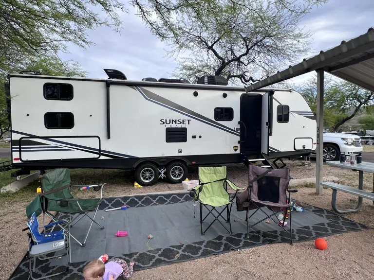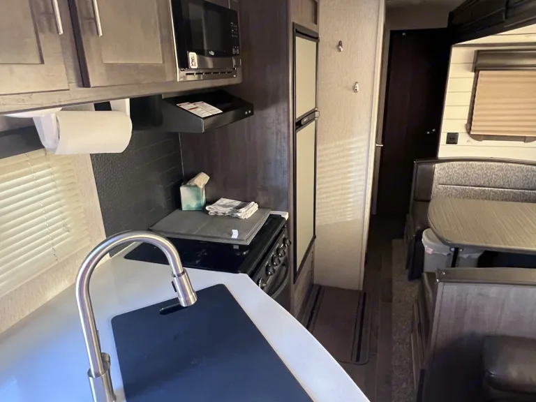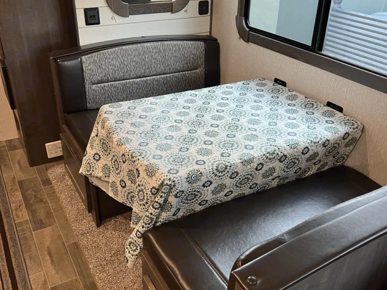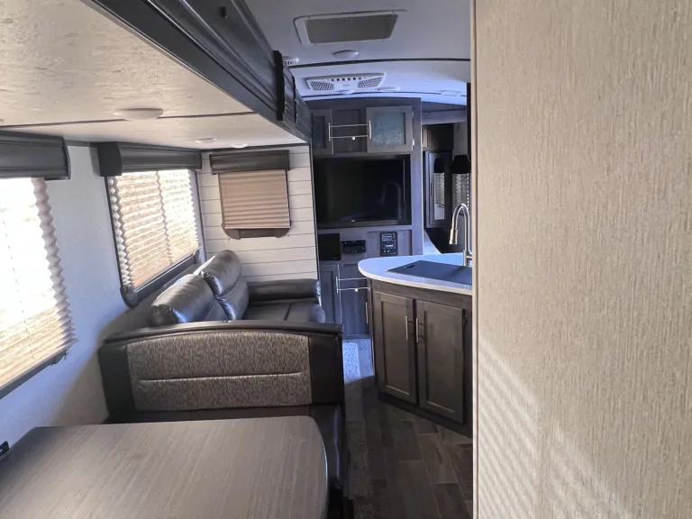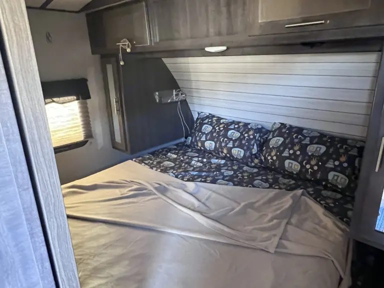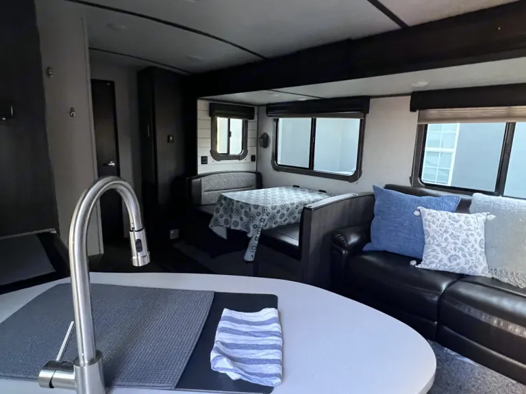 This beautiful travel trailer is super light and able to be pulled with a 1/2 ton truck or SUV. This is the perfect family trailer for those who want plenty of room for guests, but don't have a 5th wheel or have limited towing capacity.This bumper pull travel trailer has 1 slide out and all the amenities to take home away from home! This bunkhouse sleeps 10-- With a RV king with memory foam topper, 2 sets of twin bunks in a private bedroom, a convertible dinette and fold out sofa.Bonus features** Small Junior 2 person dinette in the bunk room which converts to one of the bunks!Bathroom equipped with a tub/shower combo, vanity and medicine cabinet with plenty of storage for long trips.Extra hooks throughout for maximizing hanging space.What's includedWe happily pre-make all of the sleeping spaces that you plan to use. There are extra blankets, and enough dish towels, hand towels and bathing towels for your journey! If you like to wake up to a nice hot cup of coffee while you relax outside, we supply a Nespresso machine and sleeve of pods for your trip. Plenty of dishes, silverware, spices, cooking utensils and marshmallow skewers make cooking and s'mores a breeze. We also supply an antisway tow hitch if needed. We also use this camper regularly, so we keep 2 adult camp chairs and a few kids camp chairs in storage for use if needed.We make it comfortable for you to go boon docking, and provide all the necessary hook up essentials if your site comes fully equipped.
