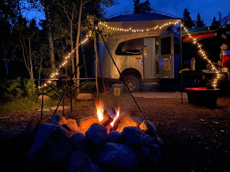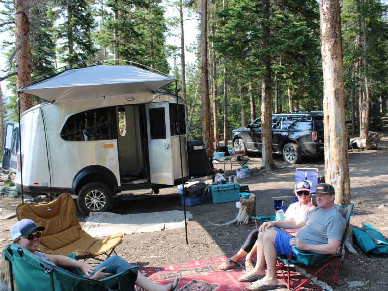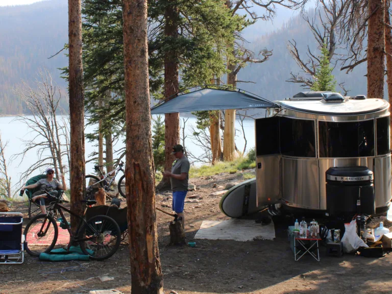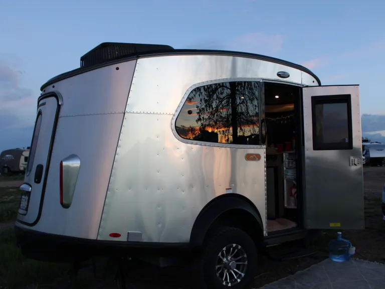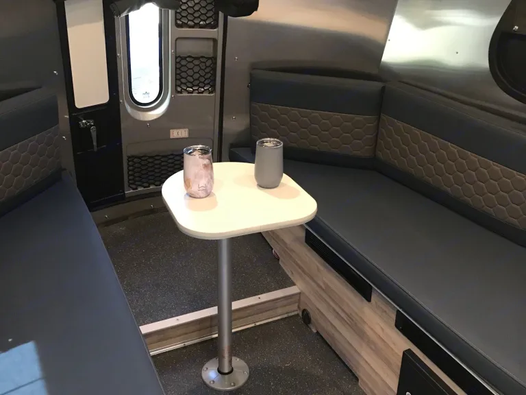 Comfort and Style. The layout optimizes the function of this small camper so it's not cramped. The panoramic kitchen offers space to work while you can enjoy the view. The bathroom is large enough to take a standing shower without hitting your elbows while washing. The dinette could sit six with extra space, while converting to the bed with several configuration options. The storage in the kitchen is abundant, even offering a place to put your muddy boots after an active day. Heated tanks extend the camping season which is so important in Colorado, where the temps can swing 50 degrees in 24 hours.Towing: