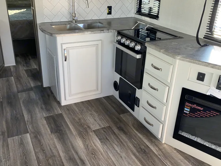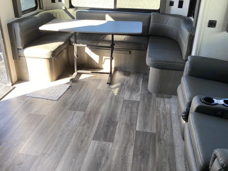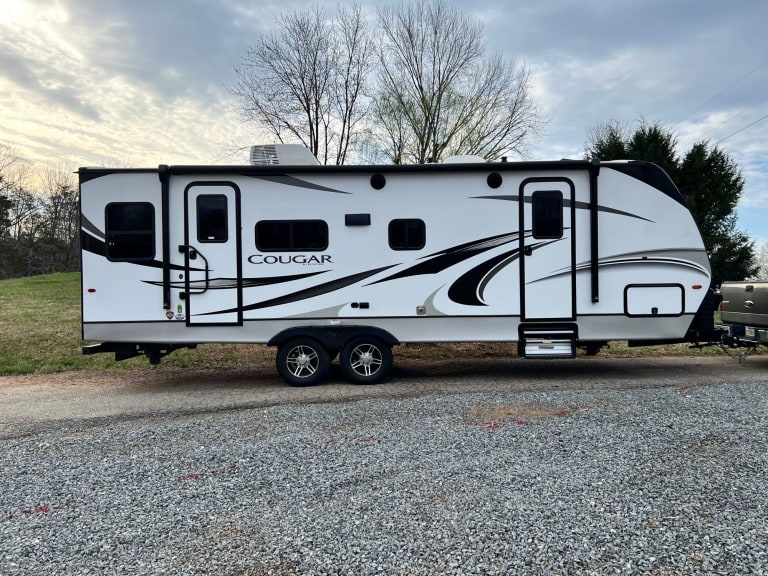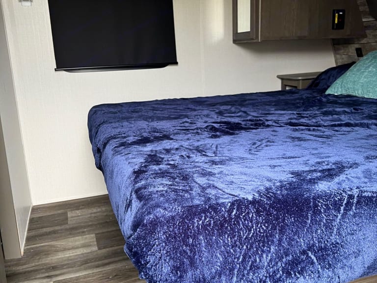Amazing set up with Large Screen TV, King size bed, U shape dinette that converts to a bed that sleeps two. Dual reclining love seat with Heat/Massage. Electric Fireplace. 200 watts solar panel that runs the Fridge. 2 entry points. Walk thru bathroom. Microwave, stove with oven. Electric jacks. In Command system that controls everything. Outside power socket/cable connection. Heated Tanks. Large awning that covers entry doors. 50amp power cord with 30amp adapter.What's includedFresh linen for King size bed/full size bed in dinette, toilet paper. Large Camping mat, wheel chucks, sewer hoses for black/grey. Water hose/ black flush tank hose. Heated water hose. 4 towels/wash cloths. Rugs in bathroom, living room and entry ways. Plates/cups/bowls/silverware for 4. Broom/dust pan.RecommendationsEmpty all tanks and flush black tank. Other things to noteNo smoking inside.