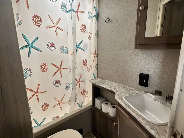 Your first impression of our camper will impress you as we keep it extremely clean! The manufacturer claims it sleeps 10, which it will, but will comfortably sleep 6-7 people. Our camper has an outdoor kitchen which is great for breakfast! We have plenty of add ons including, chairs, a fire pit, and more! The shower does have a bathtub which will be great for the little ones.We allow one dog, but please no cats due to a family allergy!We clean our camper throughly between every rental and when we use it ourselves. It is sprayed with high quality disinfectant and all hard surfaces are wiped down with disinfectants as well. All linens are washed with bleach or with Lysol laundry disinfectant. Clean clean clean!Please ask if you have any questions!We only allow delivery and the camper will be set up upon your arrival. You are responsible for the reservations and payment through the campground. We offer a generator at a rate of $50 per night. We provide one tank of gas for it.We provide a laundry basket, so please be sure to throw all dirty linens inside of it.Additional terms: