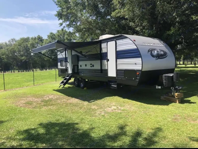 Forest is a 2021 travel trailer featuring a full Queen size bed, stovetop, oven, fridge, freezer, ice maker, fireplace, microwave, heating, cooling, inside & outside shower & so much more. Tons of storage space for a trailer this size. Under dinette storage, large pantry and large master bedroom closet.Forest sleeps 8 and comes with 1 large slide with spacious sleeping sofa that folds down into a bed. Kitchen table & seating area separate that also folds into a bed. Kitchen with plenty of space for cooking.Forest comes with an electrical retractable awning with LED lights. Outdoor carpet mat & some other basic camping supplies. Smoke alarms, CO2, and gas alarm inside as well.No smoking in the unit please!!!