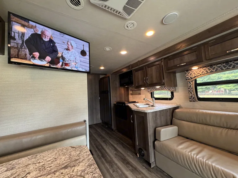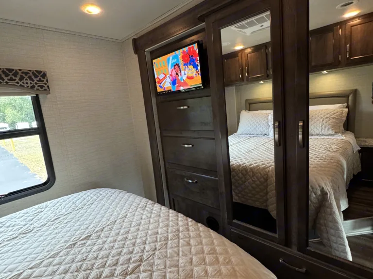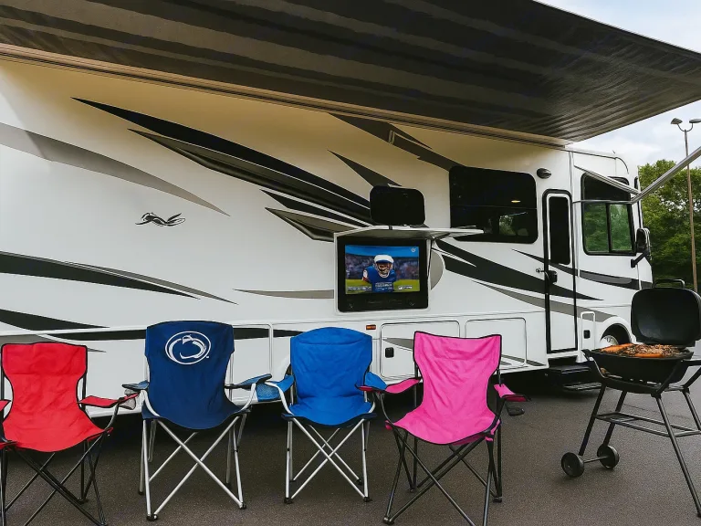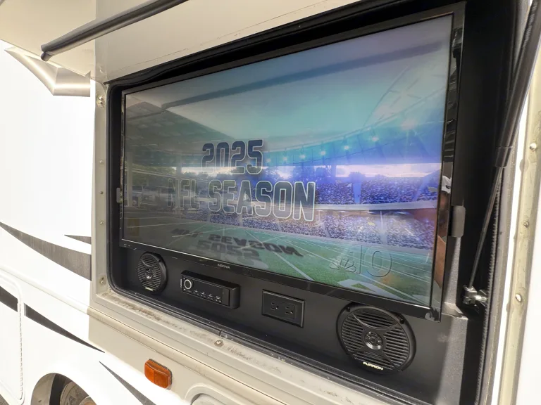• Smart TV capabilities so you can stream, binge, and stay connected.This isn’t “roughing it” — this is glamping at its finest.Tailgating Like a ProWhen it comes to tailgating, The Glamp Champ is the MVP. Imagine pulling up to the stadium, hitting a button, and rolling out your very own entertainment hub. The outdoor kitchen makes grilling and snacking a breeze, while the outdoor entertainment center (complete with TV and sound system) turns your campsite into the ultimate pre-game party zone.Bring your friends, set up some chairs, fire up the grill, and watch the game live right outside your RV. With plenty of room inside and out, your setup will quickly become the envy of the parking lot.On the RoadBuilt on a powerful chassis, this 32-foot motorhome drives smoother than you’d expect for its size. Cruise control, backup cameras, and user-friendly systems make it approachable even for first-time RVers. With 18,000 lbs Gvwr, you’ll feel safe and solid on highways, backroads, and everything in between.Whether you’re hopping between stadiums, heading to the mountains, or chasing the coastline, The Glamp Champ gives you the confidence to travel anywhere in comfort.Sleep Like a ChampSleeping arrangements are flexible and family-friendly: