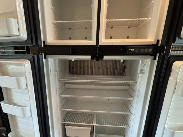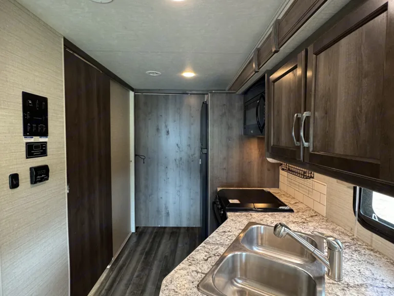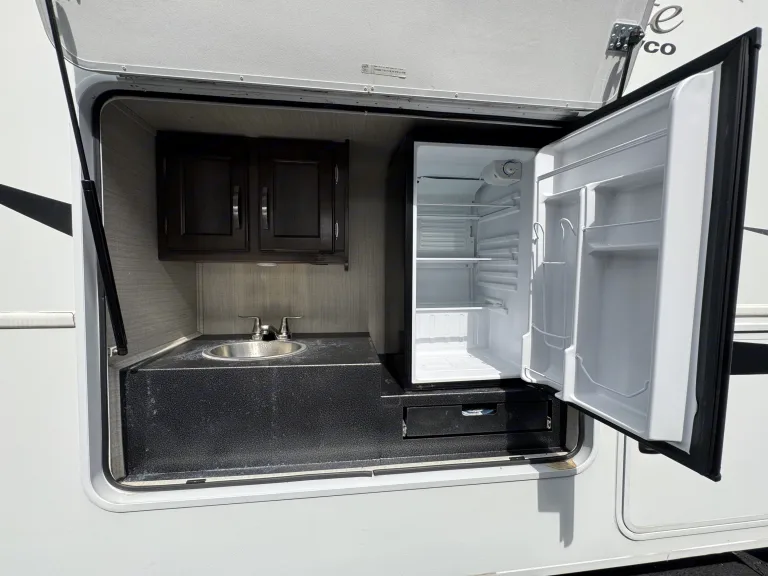 • Sofa Sleeper (a comfy crash pad after a day of fun)Eight people can stretch out without feeling crowded, and the full-wall slide really makes a difference.A Bathroom You’ll Actually LikeForget the tiny “closet bathrooms” in most campers. The full-wall slide allows for a larger bathroom, giving you space to actually move around. Hot showers, functional storage, and a real sense of convenience mean you won’t be “camping,” you’ll be living.Cook Inside or OutHungry? No problem. Inside, the full kitchen includes: