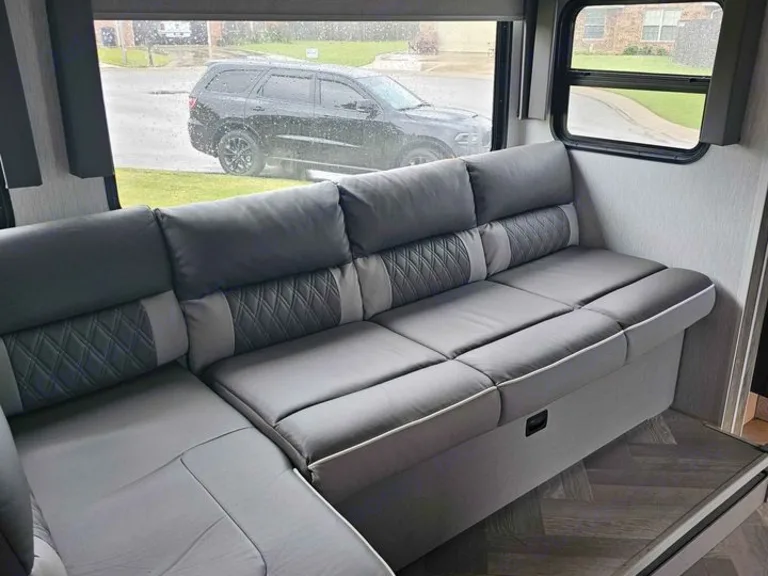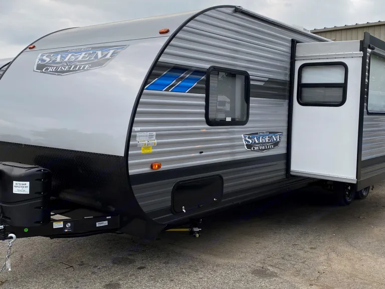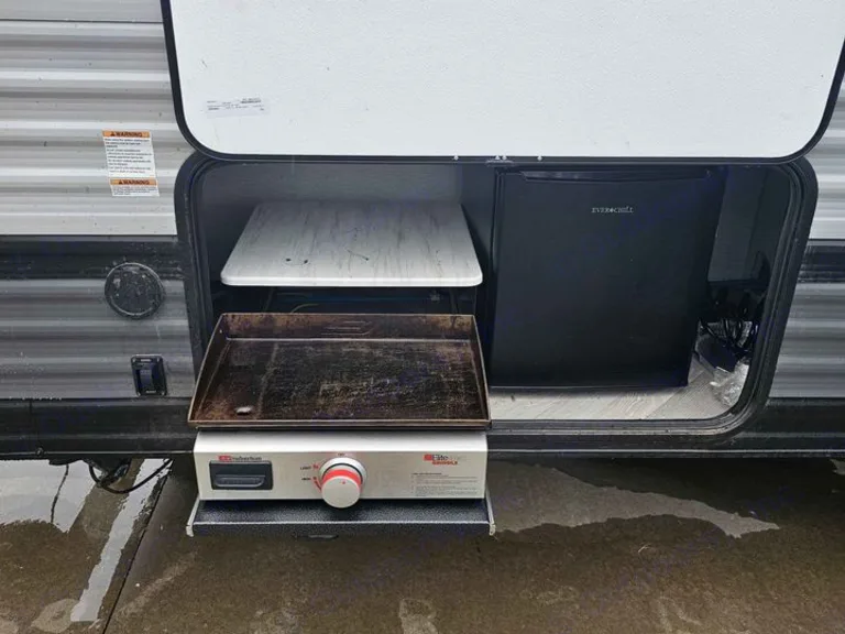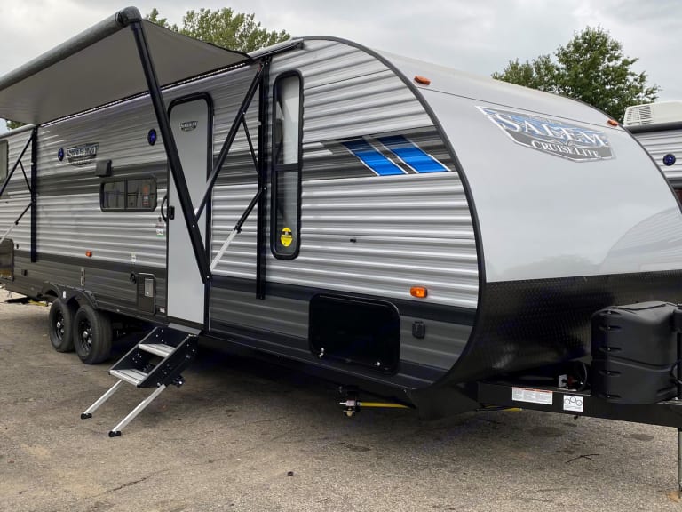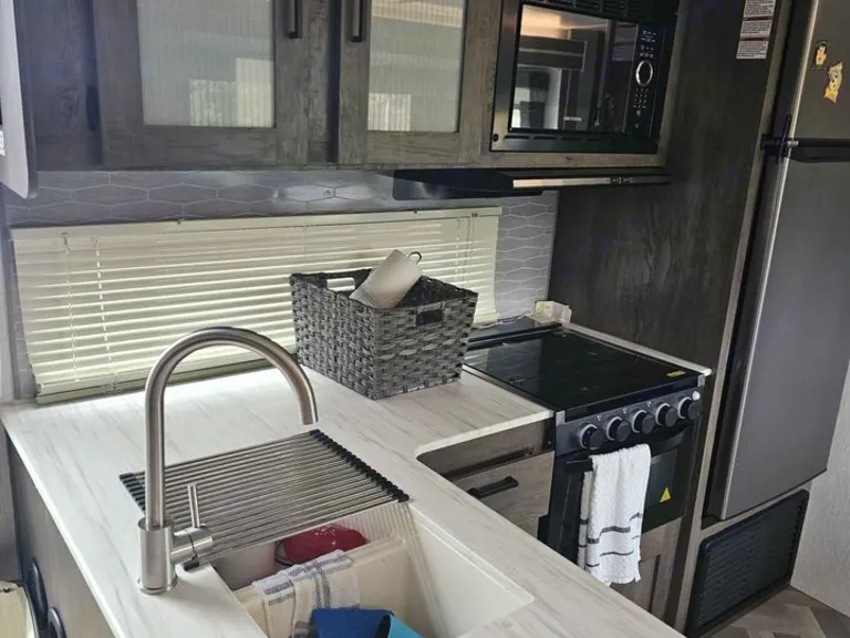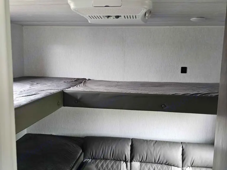 The 273Qbxl is a versatile, lightweight bunkhouse that weighs in at less than 6,000 lbs and can easily be towed with a 1/2-ton truck. This travel trailer is packed with features, including bunks, an outside kitchen with a mini fridge and flattop grill, U-dinette, Versa-Lounge, and a walk-in shower. The kitchen includes an oversized 11 CU. FT. refrigerator, stovetop, oven, and pantry. The trailer is fully sanitized and cleaned after each rental. 10% discount for Veterans using code Milvet.What's includedAll the dishware you could need to prep and serve meals