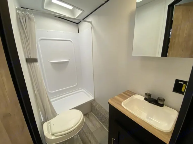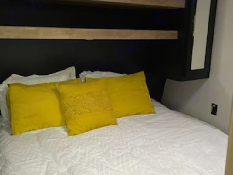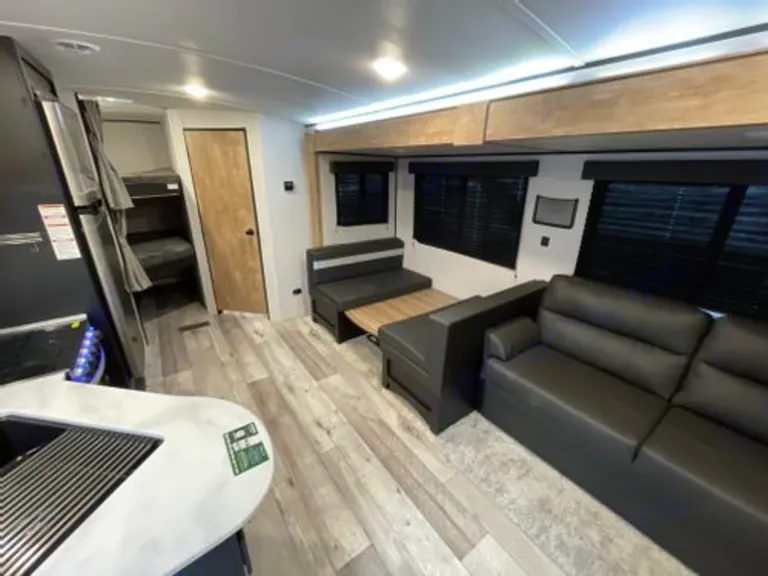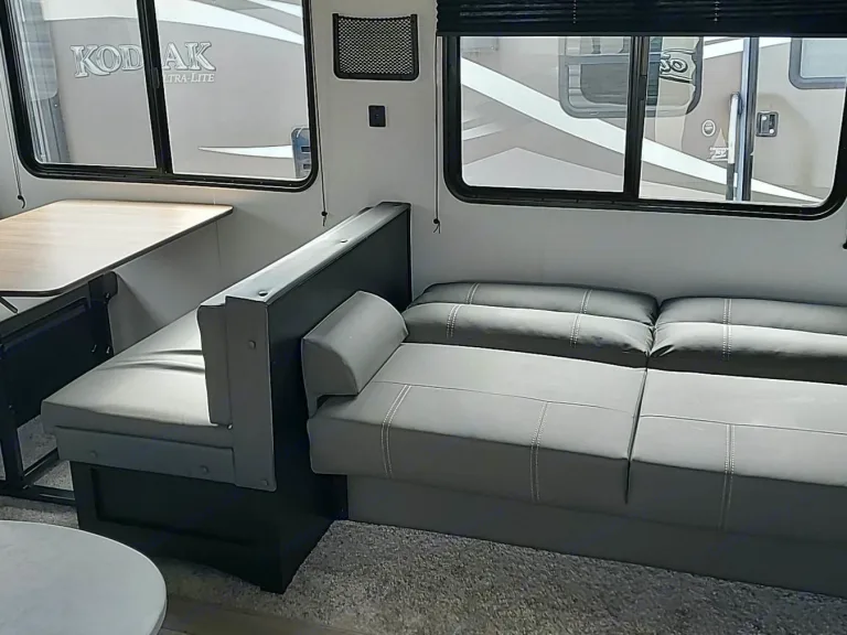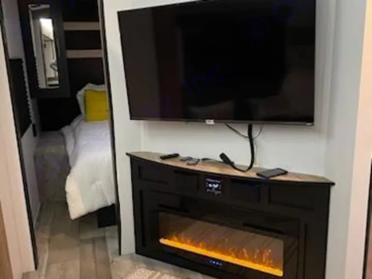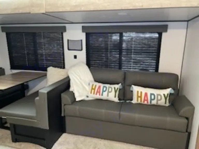 Living area: U shaped dinette that coverts to a double bed and the same with the pull-out couch (double bed). The living area contains an electric fireplace on those chilly fall nights. There is a 43” smart TV. We also provide game boards for the kids.We have a pop up garbage can with garbage bags, and cleaning supplies, dust pan and broom and a swiffer.