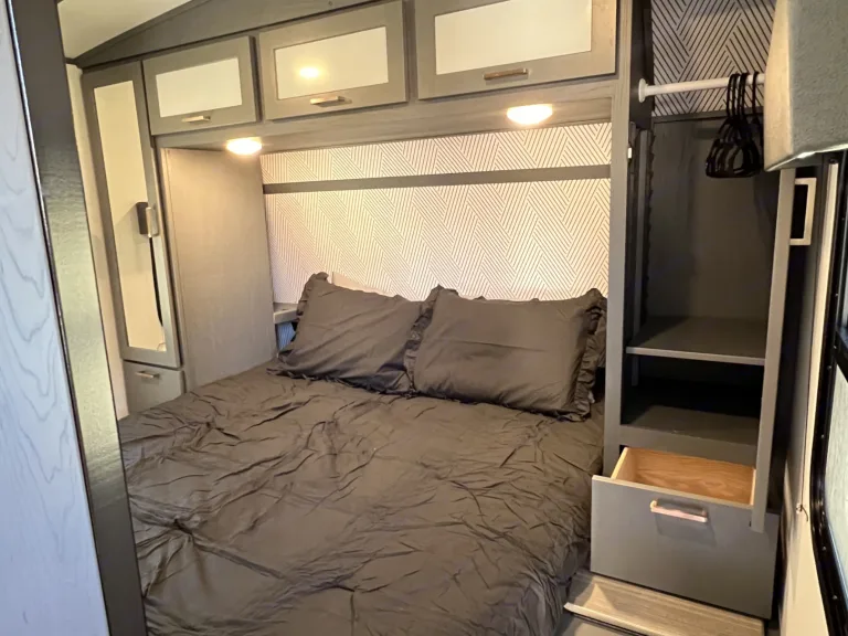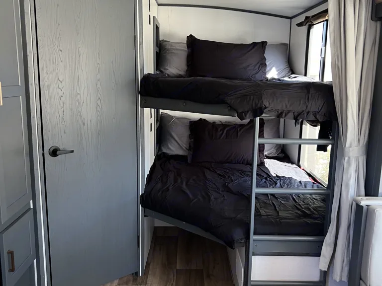 Each bunk bed comes with dual 12v usb connections for easy charging and each side of queen bed does too!