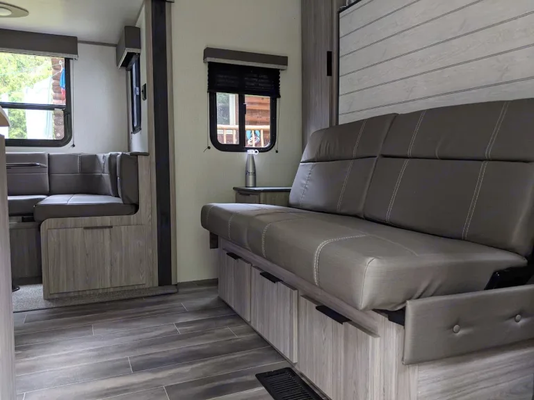 Kids (and adults) love the cozy double over double bunks. The comfy queen murphy bed converts to a couch during the day and the large u-shaped dinette and slide out makes for a spacious interior with additional sleeping options. Tons of storage space in the large pantry, drawers and wardrobes.