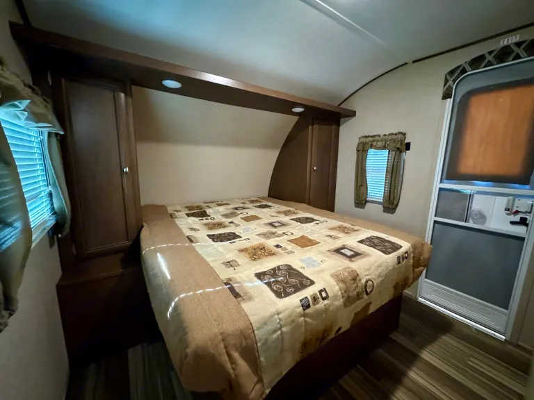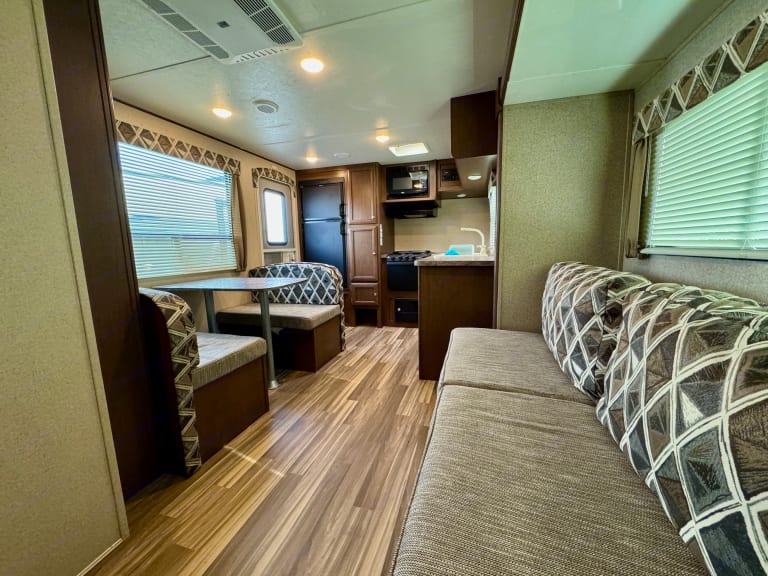 Designed for your comfort, this spacious trailer comfortably accommodates 5-6 people, making it perfect for family getaways or trips with friends. At the front, you'll find a cozy queen bed for a restful night's sleep, while the pull-out couch and dinette bed provide additional sleeping space. The living room is designed for relaxation and versatility, featuring a pull-out for extra room when needed.Equipped with modern amenities, this trailer ensures a convenient and enjoyable camping experience. Stay cool in the summer and warm in the winter with air conditioning and heating systems. The power awning provides shade and shelter, while LED lighting illuminates your outdoor space.You'll appreciate the convenience of having a toilet, shower, fridge, and stove onboard, allowing you to prepare meals and freshen up without leaving the comfort of your temporary home. Whether you're exploring the great outdoors or enjoying a weekend getaway, this trailer offers all the comforts of home in a compact and versatile package.What's includedKitchenware