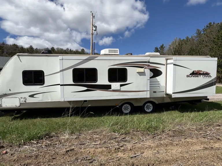 A nice bunkhouse travel trailer with a queen bed, fold out couch, dinette, kitchen with oven and microwave, bathroom with tub, and bunkhouse with one pull out couch on bottom and two top bunks.Other nice features are an outdoor kitchen with a big mini fridge, large awning, bike rack on the rear, and plenty of storage.You will need a 3/4 ton vehicle to pull this. Included with rental is the trailer hitch with stabilizers.What's includedIncluded with rental is all silverware and Dishes, silverware, toilet paper, and fire pokers, fresh linens and towels, extension cords, cleaning supplies, toilet paper, pop up trash cans, and electric skillet.• Fresh sheets will be provided. Bring your own pillows and blankets.Delivery and pickup available upon request within 100 mile radius of 54656RecommendationsI recommend to go to campgrounds that for sure can accommodate this size of rig. Some campgrounds do not have sites large enough for this size rig. Other things to notePets welcome. No festivals. No smoking.
