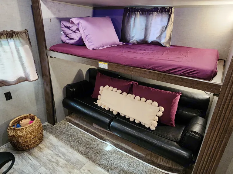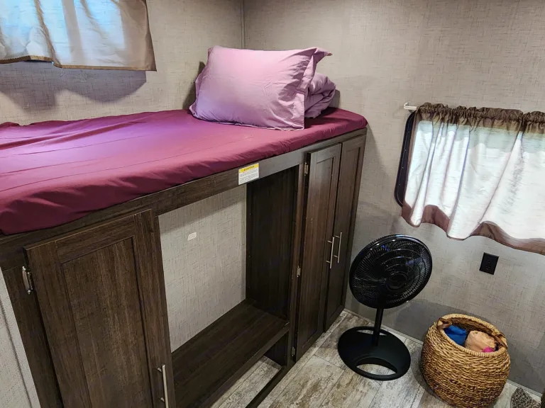 RV rental bunk bed interior with storage, a standing fan, and a woven basket. A compact, functional living space.. Crossroads RV Zinger 2019