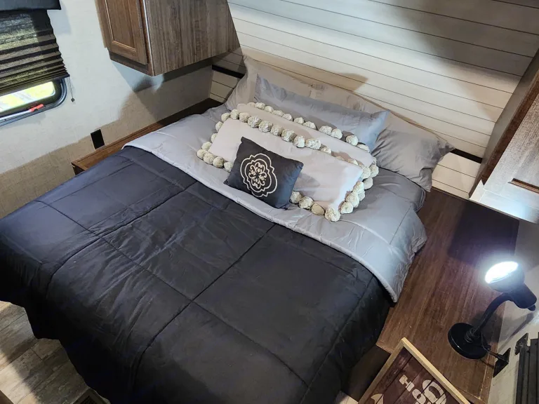 Cozy RV rental bedroom featuring a dark bed, decorative pillows, window with blind, and a functional reading lamp.. Crossroads RV Zinger 2019