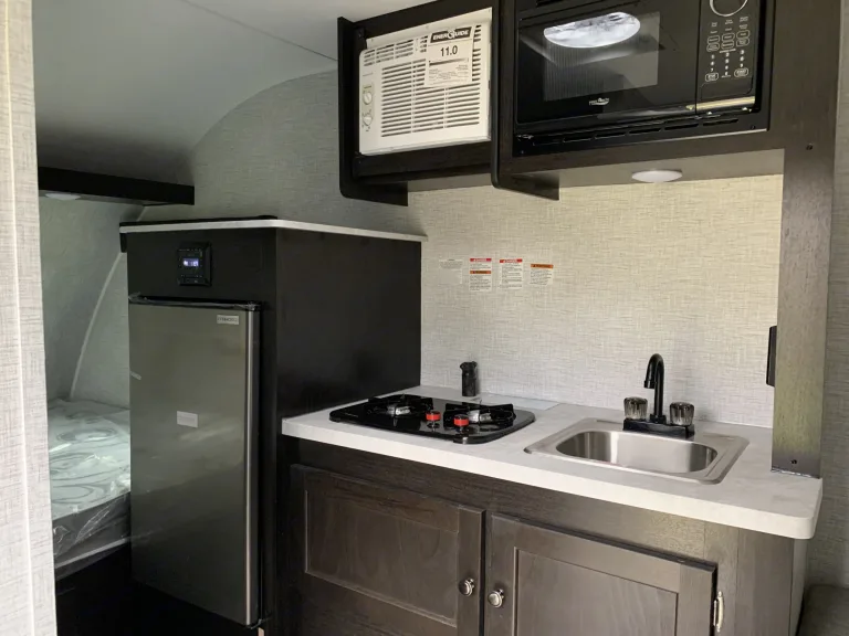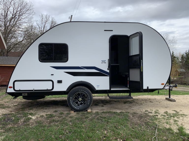 17 foot teardrop trailer with queen size bed and dining conversion bed. A/C, heat, microwave, fridge, sink, propane stove top, blue tooth radio, toilet and small shower (indoor and outdoor shower). Fresh bedding provided. Solar panel hook up. Trailer break controller required. What's includedFresh linens and cookware including cutlery, plates, bowls etc. Dish soap, dish towels, toilet paper, 1 full propane tank. RecommendationsGreat for North American road trips! Other things to noteNo smoking. Damage deposit required upon booking. Pet friendly