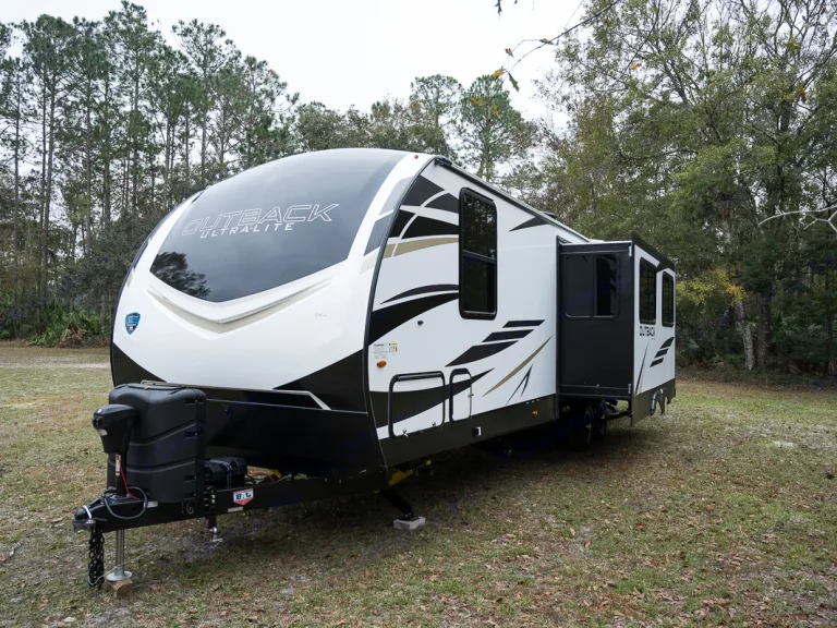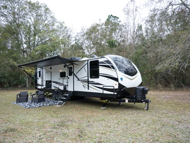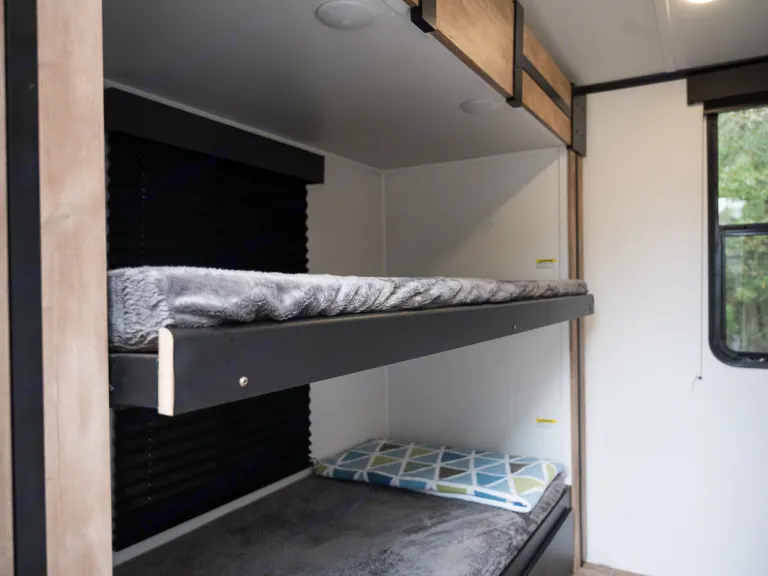 2022 Keystone Ultra Lite 301 UBH with two entrances, one and a half bathrooms, private bunkhouse, and comfortable sleeping for up to five people. Book your camping space prior to booking the RV.Glamping with your family? This RV has the perfect space for your little or big kids to nap without interruption, room to play, with a private space as needed. Two entrances means that younger children, or adults, who need naps will not be interrupted while others are going in and out of the RV. An additional half bathroom is an added bonus for travelers!The outdoor awning and kitchen provide the perfect space for enjoying North Florida and South Georgia and the weather any time of year. Equipped with solar panels, instant hot water, heater and AC, you can enjoy the outdoors without sacrificing comfort.Included in the RV are sheets, blankets, bath towels, dishes, cookware, a coffee maker with coffee, paper goods, and trash bags. Outside the RV is an outdoor kitchen, large awning with lighting, a huge 9x18 patio mat along with chairs.As of 1/29/2024 , we no longer deliver to Daytona Beach Speedway.What's includedFresh Linens