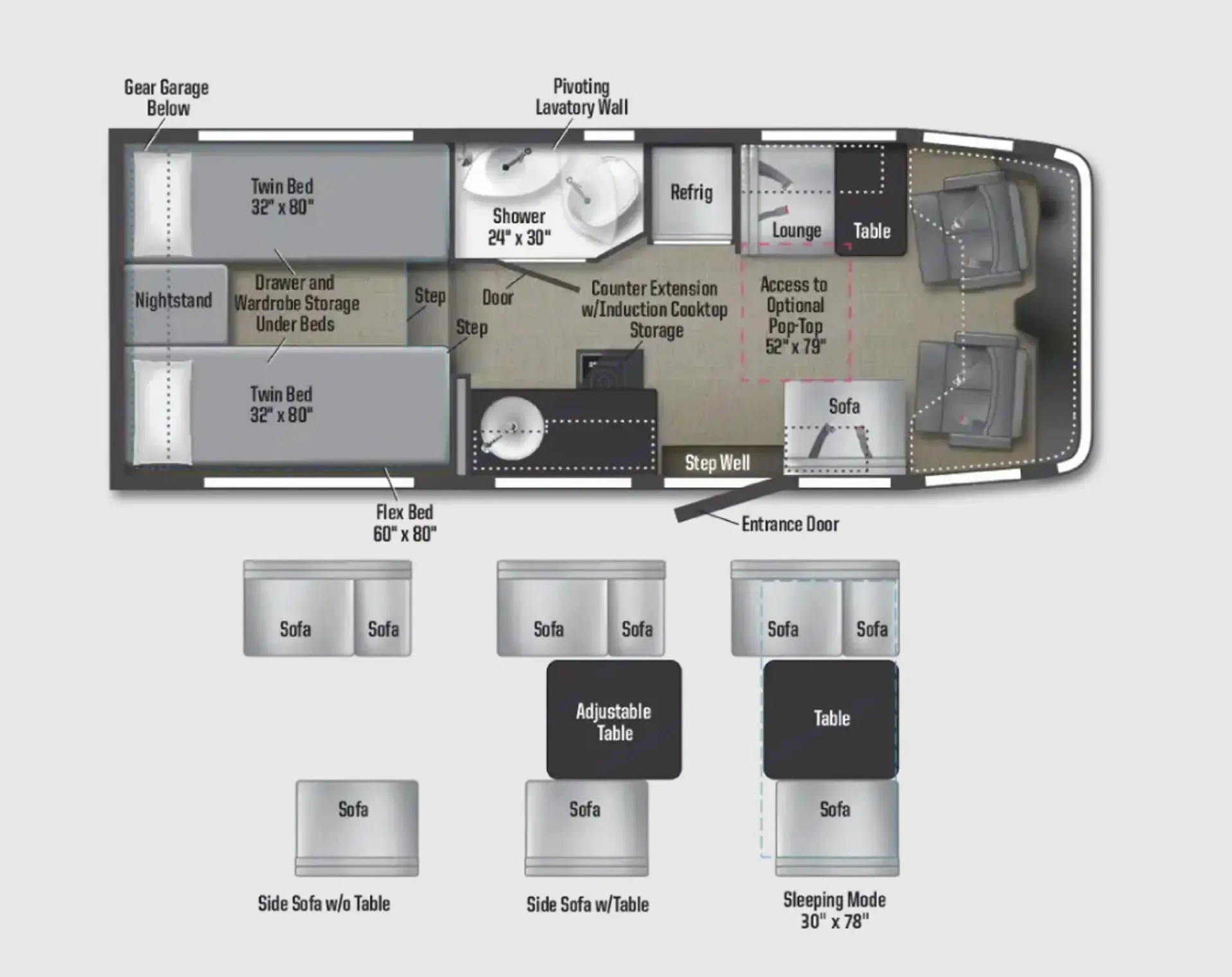 Spacious Interior: Thoughtfully designed layout with a comfortable living area, kitchenette, and dinette that converts into a bed for added sleeping space.