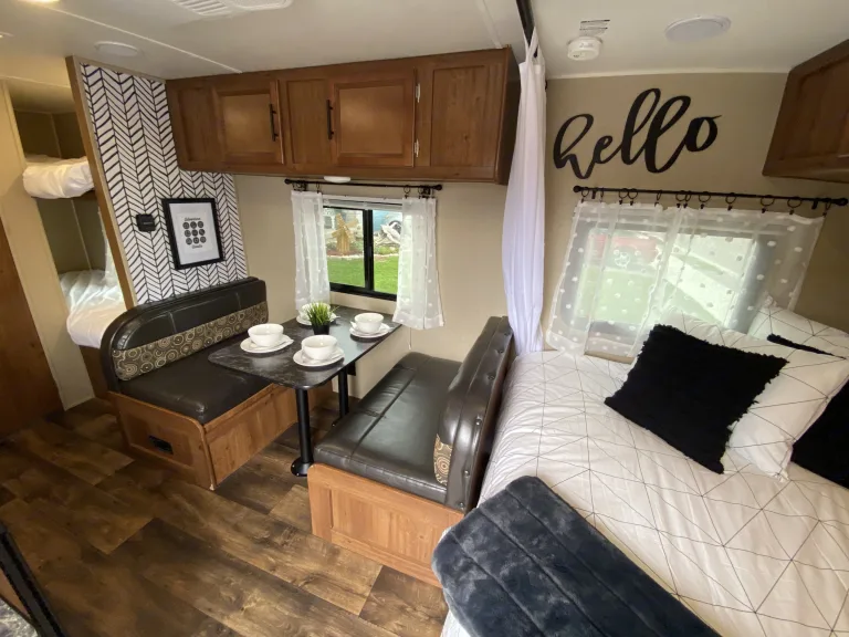 This Newly renovated 2016 trailer will keep you and your family as comfortable as you would be at home!This easy to set up trailer can sleep 5 with it's queen sized bed, bunk beds, and dining table that converts to an additional bed. A bonus, this trailer can be pulled by mid sized SUV because it only weighs 4000 lbs!***We are extremely clean and keep our trailer as such. During Covid, we thoroughly disinfect the trailer to ensure it is completely safe for our guests.***The trailer includes air conditioning, heating, radio, an adjustable awning, toilet, inside shower, bed linens, and basic cooking needs. It is comfortable, clean and great for family and couple getaways.Some additional add-ons for your consideration are: Portable Generator, Campfire Starting Kit, Sports/Activity Kit, 21" TV, Coleman Stove and more.Please Note: